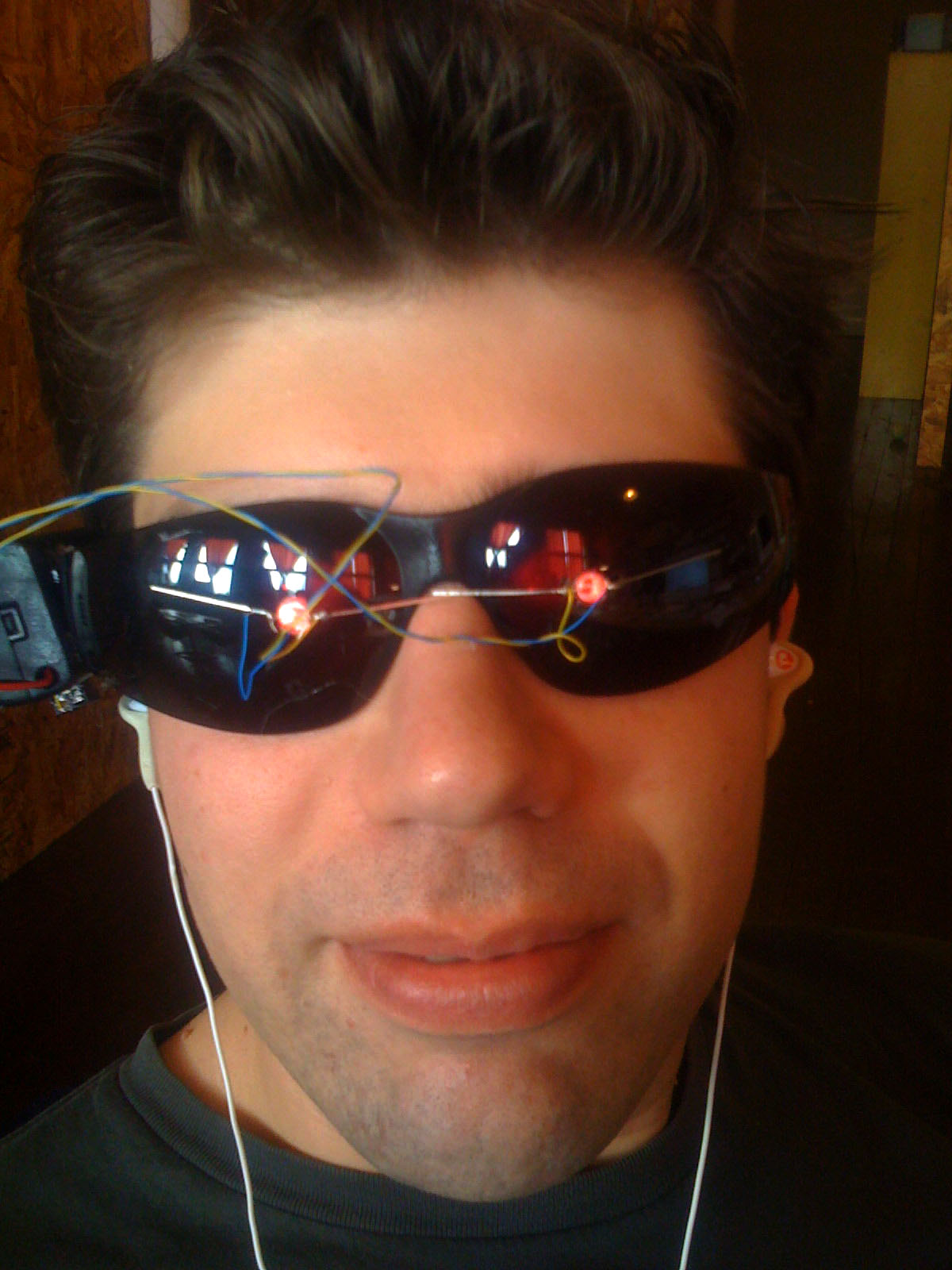 So, this isn't exactly the most flattering pic of me, but it's kinda funny - a coworker brought in these flashing glasses that are supposed to attenuate your brainwaves to their alpha channel or something. I tried 'em on, and it was instant migraine time - so much for my attenuated brainwaves! I left early that day... but I did think that the glasses looked pretty cool. Maybe they'd be more comfortable for me if the flashing lights faced outward...