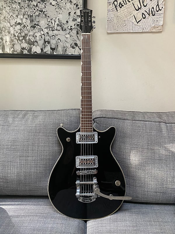 well, another passenger has signed on to my Ship Of Fools. this is a late-00s Gretsch Electromatic Double Jet. the previous owner installed TV Jones FilterTrons, but he did a lousy job of it; you can see that both pickups are at an angle to the proper position, and he cut into the mounting ring for the neck PU which should not be necessary. i'll have to wait for it to arrive to know how much i'll need to do. if i have to take them out and do a total remount it'll be fine, cos TVJ has parts specially designed for mounting Filters in a Pro Jet which was a popular mod for the 2000s PJs with those weird little Gretsch mini-humbuckers (as the perpetual Odd Man Out, i put Dynasonics in mine). it also needs to have a hole drilled/filled where the bottom strap button ripped clean out of the guitar (the mahogany or equivalent on these guys is quite soft and thus prone to screws ripping out). i'll probably add a Gretsch tone switch, possibly with rejiggered capacitor values to make it more useful. the classic Gretsch "rocking bar" bridge drops right on to the Tunomatic studs. i've played these guitars with the B5 Bigsby on before and it works fine, but aesthetically it just screams WRONG; i have an ancient B3 which i'll install, and find a cosmetically pleasing way to fill the B5 holes. oh, and a pickguard. $345 plus shipping, and the TVJ pickups are4 like $100 each. a pro-line Double Jet with TVs would run you a cool $1200-1400.