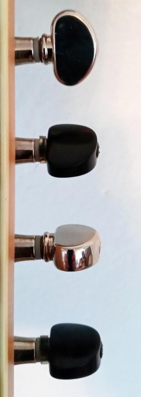 a small job while i get ready for bigger stuff. i have a terrible time telling the tuner knobs apart when i'm playing 12-string, which makes it hella difficult to stay in tune. i decided that it would be a good idea to change every other tuner knob from the chrome mini Grover knobs to wooden knobs. it works a treat. the wooden knobs are a bit shorter along the shaft axis than the originals, which looked a bit funny. i contemplated the situation for a bit, and realized i have a piece of plastic tubing about 9" long; i cut little rings about 1.5-2mm deep and used them as spacers, and it came out quite well. i highly recommend this for 12-strings.