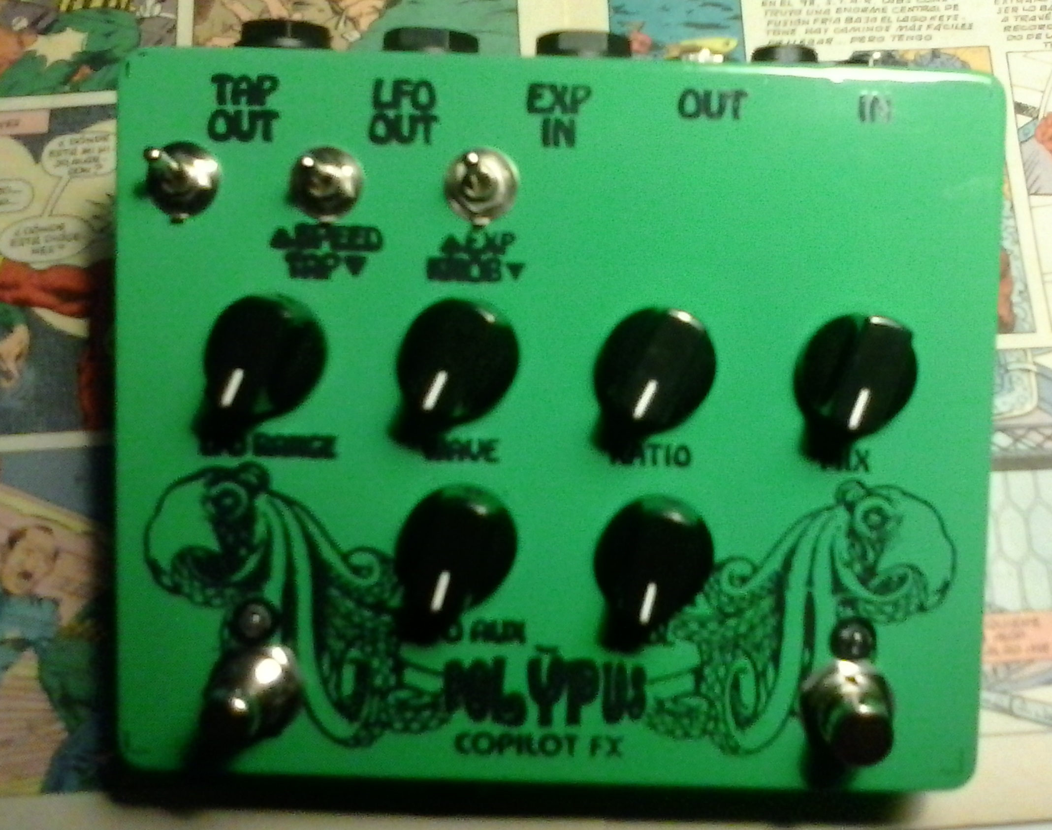 Custom Polypus + Broadcast : There are 2 taps outs (normally open and normally close) to sync other pedals, EXPRESSION out like a broadcast (will work when the tremolo is bypassed), expression in to control the rate or tap ratio or the lfo, and there's a switch so the the tap out are synced to the tap ratio of the lfo, so you can tap in the pedal and via the expression change the tap ratios so you can play/create some tap patterns with your delay or other devices with tap in.