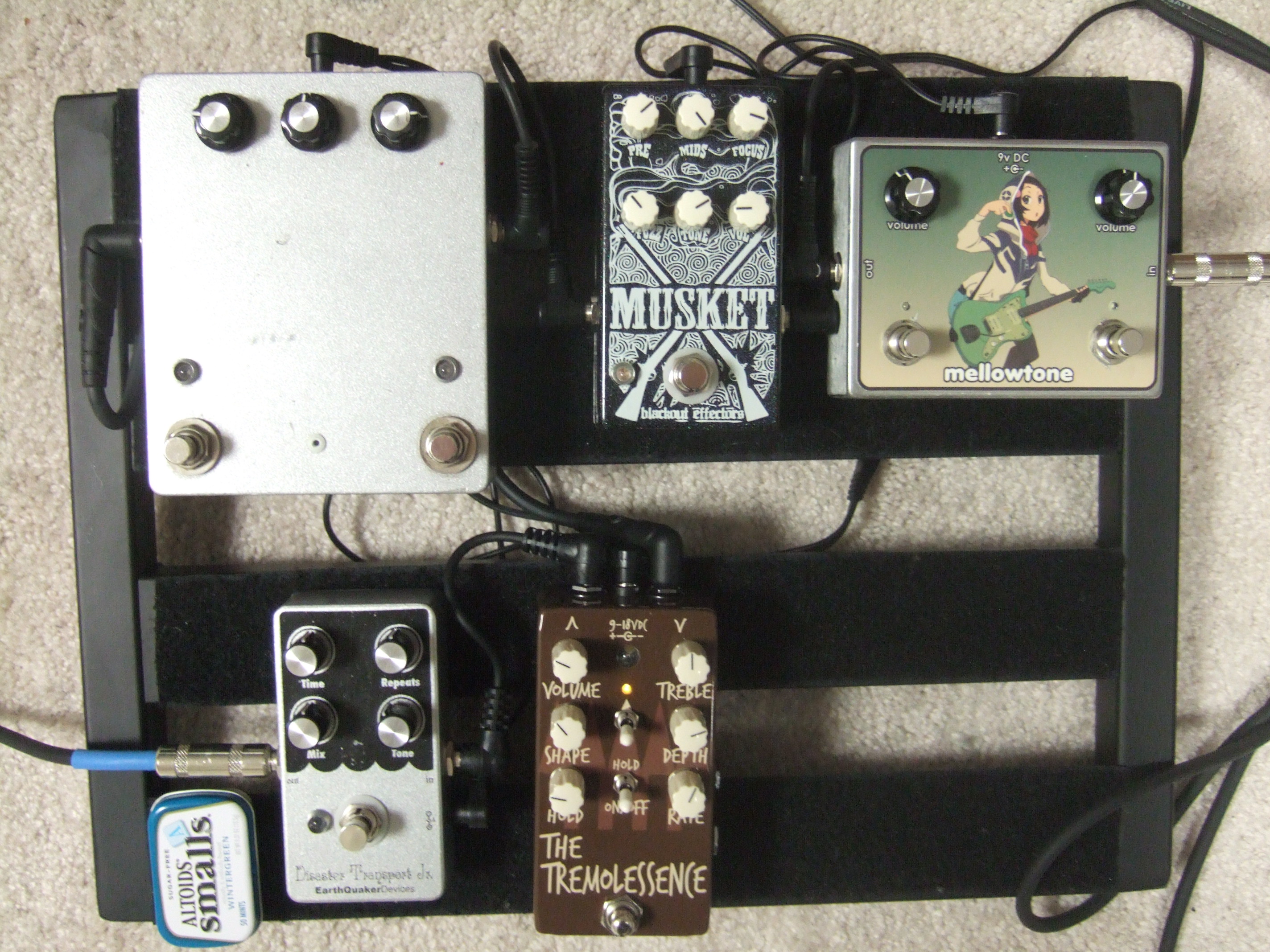 With today's addition, I went ahead and kind of finalized where everything is on the board. I now have 3 fuzzes and 1.5 distortions (that MXR distortion sucks, I just use the preamp). I might need to let some fuzz go and replace it with some sort of modulation. Probably the AB, I'm thinking.