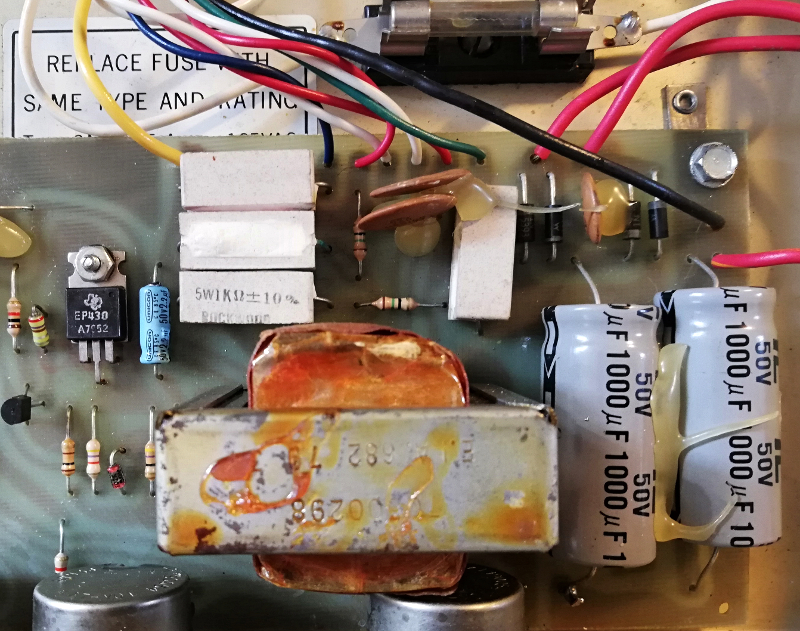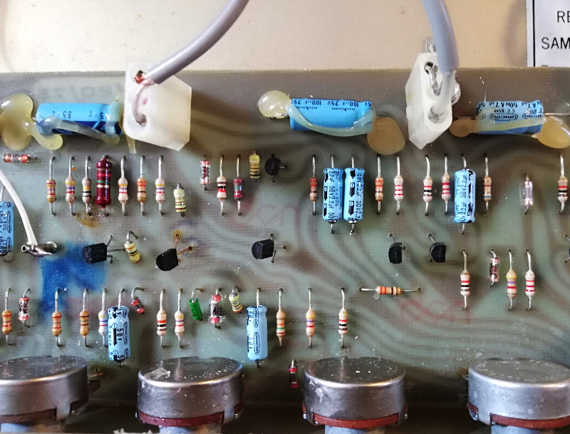 I like the wavy circuit design and all the different diodes/resistors. And the transformer, gee. This was right after I sprayed the deoxit in a few spots, which cleared up things a little. I don't think it made much difference tho, seems it's just the preamp gain pot that has a rough first half of its sweep, some nasty pops, but it's fine once you set it.