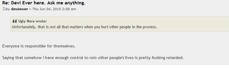 why is this thread so long? I get that devi is not a good person and her internet activity is a source of perverse entertainment, but I really feel like she doesn't deserve the attention or discussion