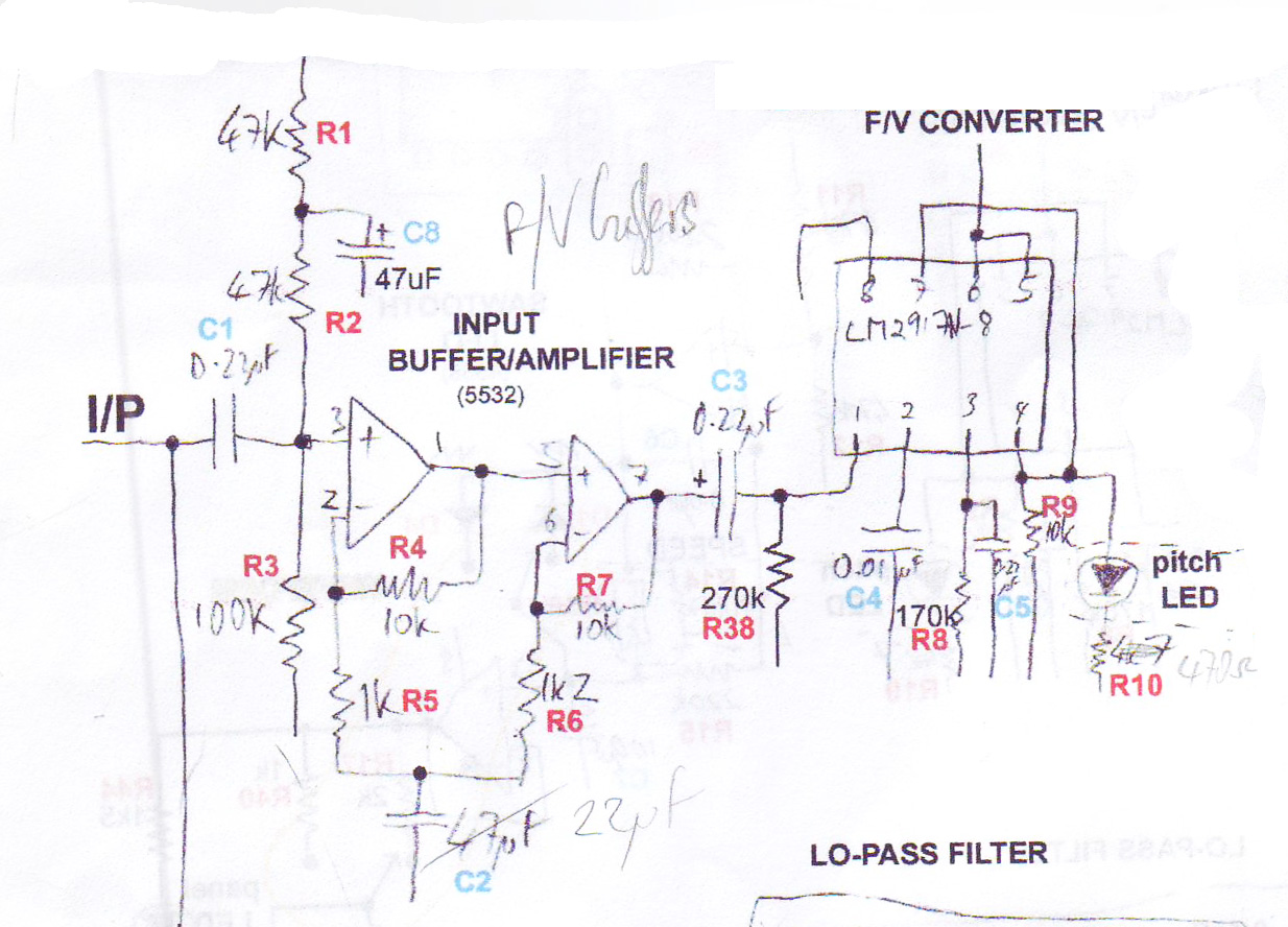 BTW I just got a Pigtronix Mothership, and the frequency to voltage is amazing - synth note can track perfectly in tune with the guitar note. This circuit here, I don't think it follows exactly like that... above A (5th fret on the top -thinnest - string) the LED is pretty much at its brightest. That's when it's set up with a (quietly played) lowest E note giving no illumination at all, and the 1st fret F being slightly on.