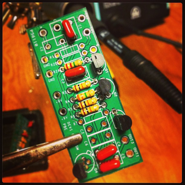 as this will short the input to ground when bypassed so that you don't get any noise bleeding through. Use some jumper leads to connect all your grounds together as well. I'm not sure if her designs rely on the housing to complete the circuit or not. You can pick up a 10 pack of little jumpers for pretty cheap if you have a Northern Handyman or Harbor Freight around. Make sure you have enough solder in the holes but not so much that it is touching a neighboring hole. Make sure there are no flyaway leads, or solder tracking. Use an alligator clip on the leads of your transistors to help prevent them from overheating when you are soldering them in. It works a a simple heat sink.- eatyourguitar