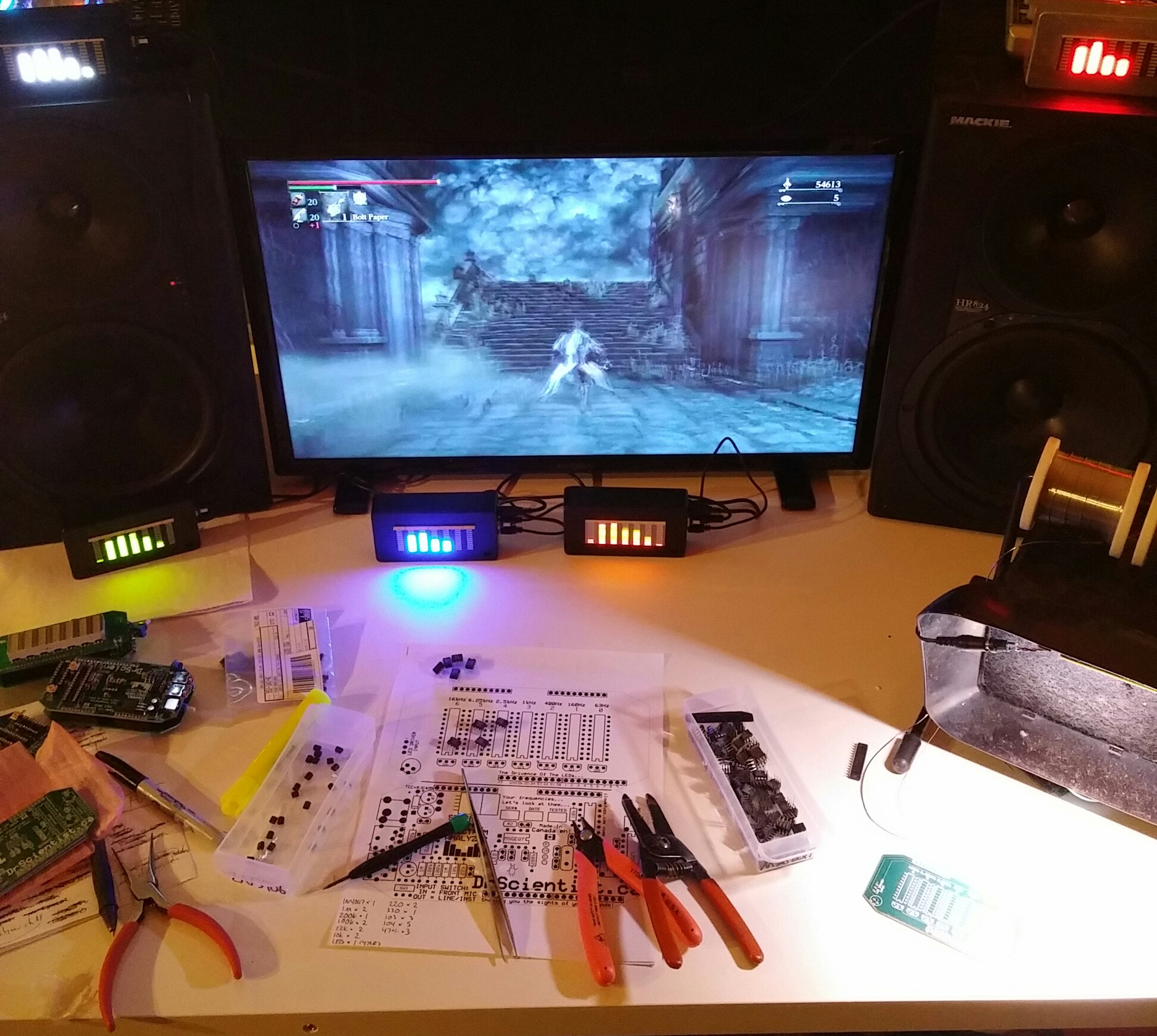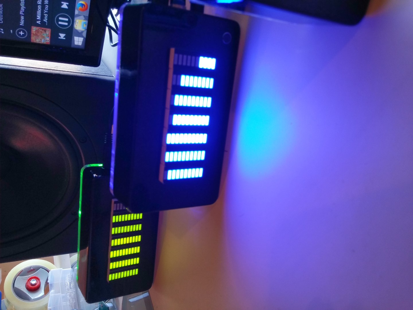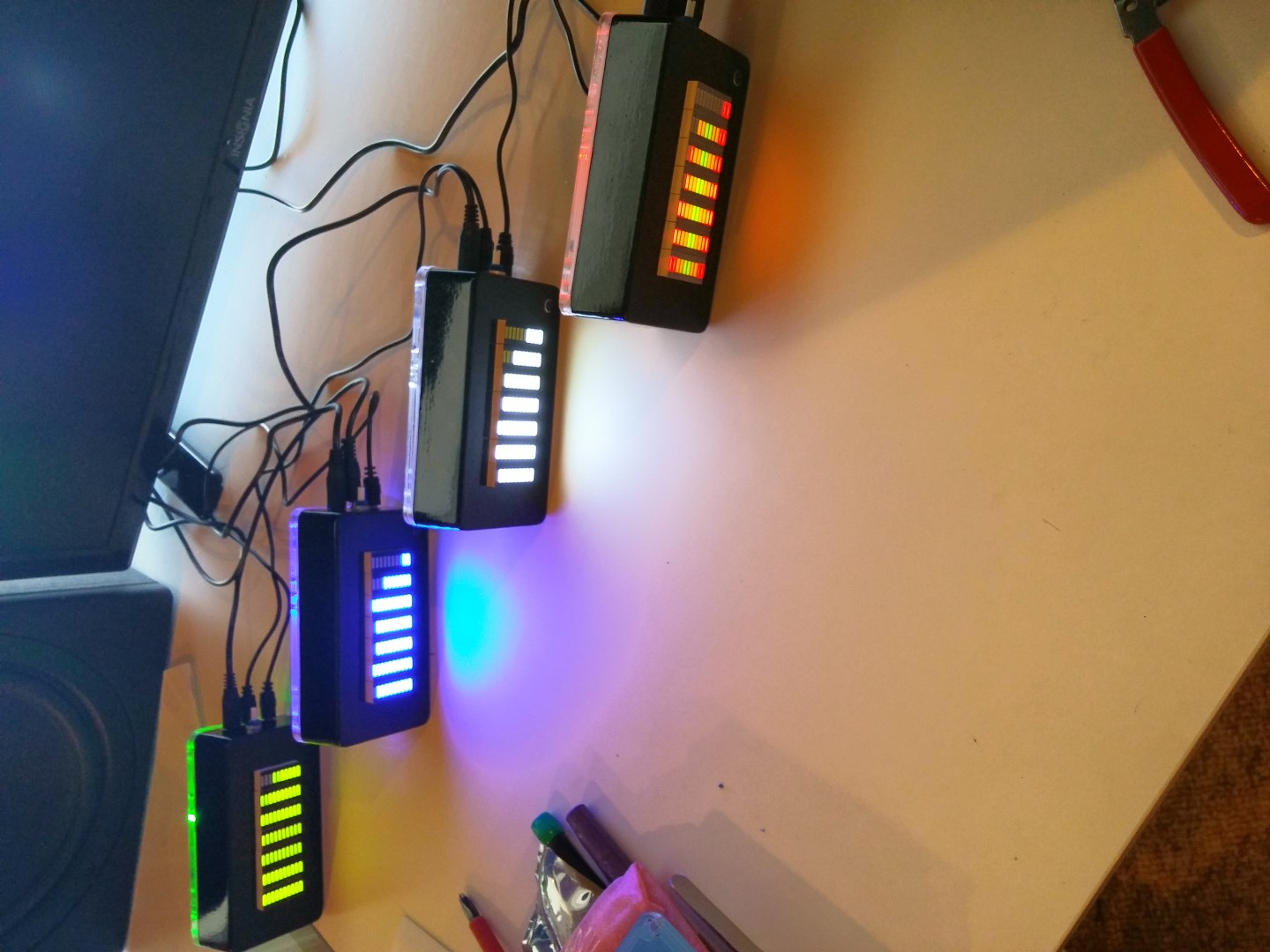 Here's some pics of the build, there's two pcbs that are stacked, one has the bar graphs and the transistors that drive them and the other has the jacks and the audio buffer, the filter chip, the microcontroller, and the bar graph display driver.