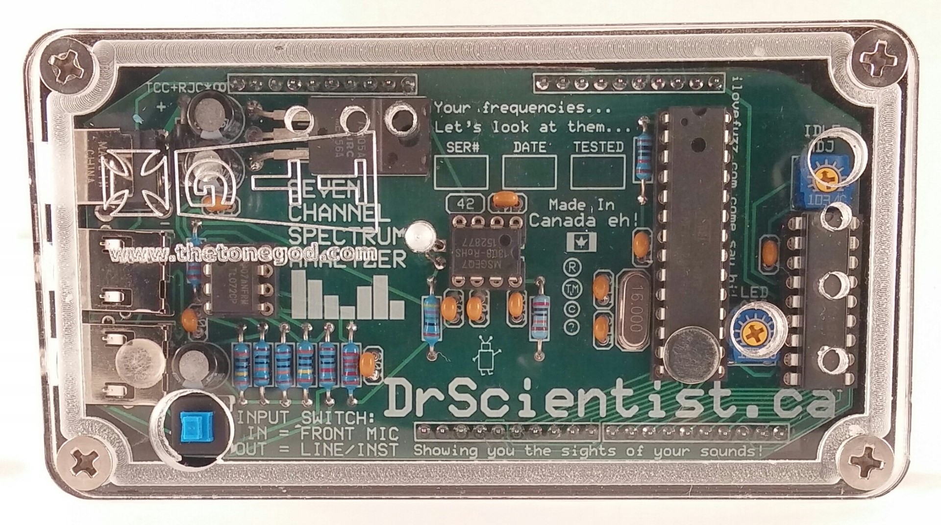 Ok, let's start with what this thing is hey... the Spectrum Analyzer is a purely visual device, it's a looky-box, you put it where you listen to music or where you play music and you enjoy the visual display of your audio. The Analyzer is a complicated little computer that your audio signal is plugged into so it can read the signal. Your audio signal doesn't go through the analyzer, more like the analyzer is sitting on the fence and staring at your audio. It has a very high impedance buffer that has no impact on your signal at all, it's like it's not even there as far as your audio signal is concerned. It looks at your signal and then splits the signal into 7 filter bands: 63Hz, 160Hz, 400Hz, 1000Hz, 2.5kHz, 6.25kHz, and 16kHz. The intensity or quantity of signal in each filter band is then displayed on a corresponding bar graph LED on the front panel. The bar graphs go from lowest freq, 63Hz, to highest freq, 16kHz, from left to right.