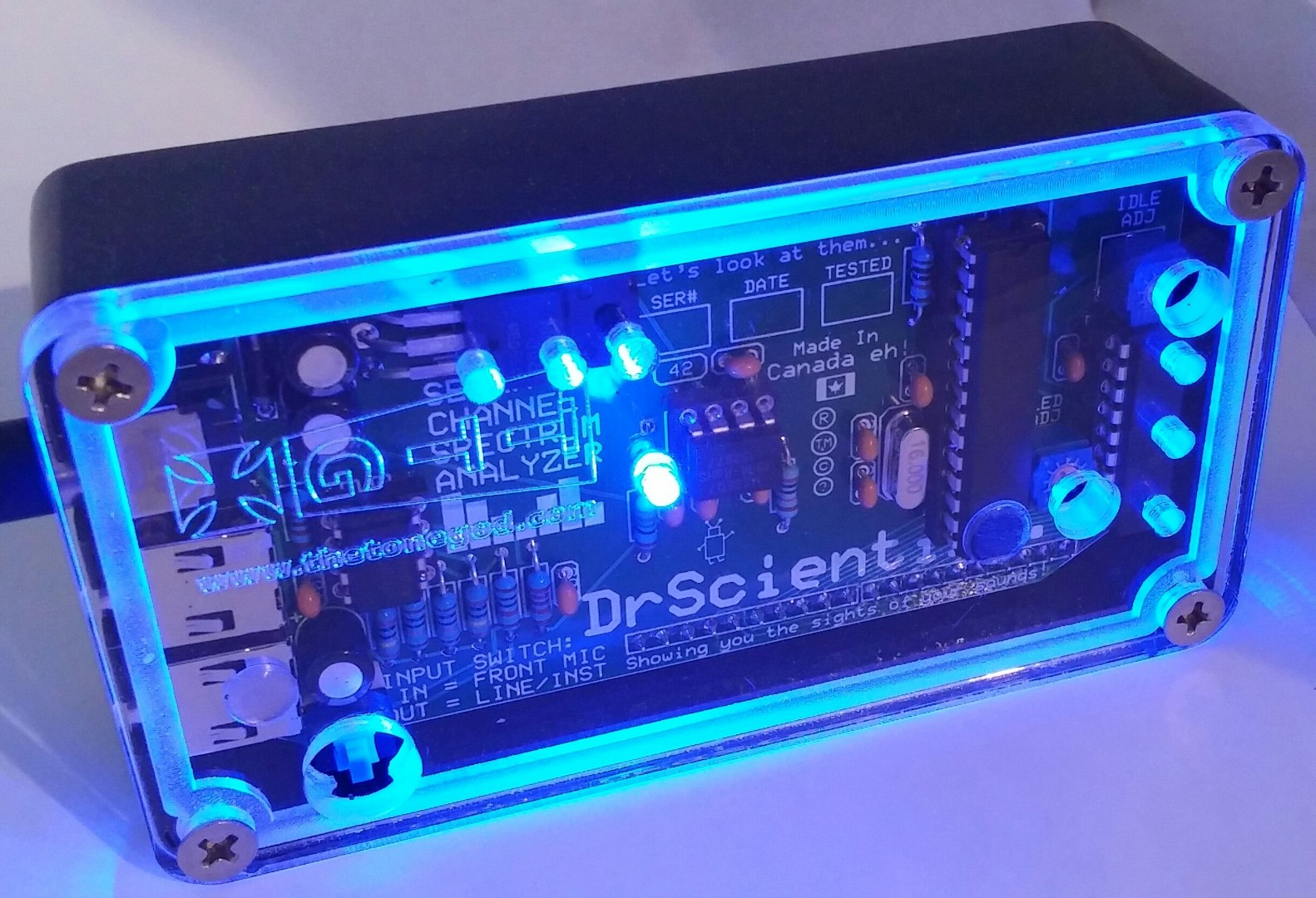 The analyzers come in a black sparkle box and the lights themselves can be a few different colours. For the production version I'm just going to do blue and red, colours that I can get easily, but for this pre-order you guys are gonna have a choice of blue, red, green, yellow, white, rainbow (I'll use a bunch of different ones for you), or old-school. (old school bar graphs are dimmer and they go red/yellow/green/yellow/red)