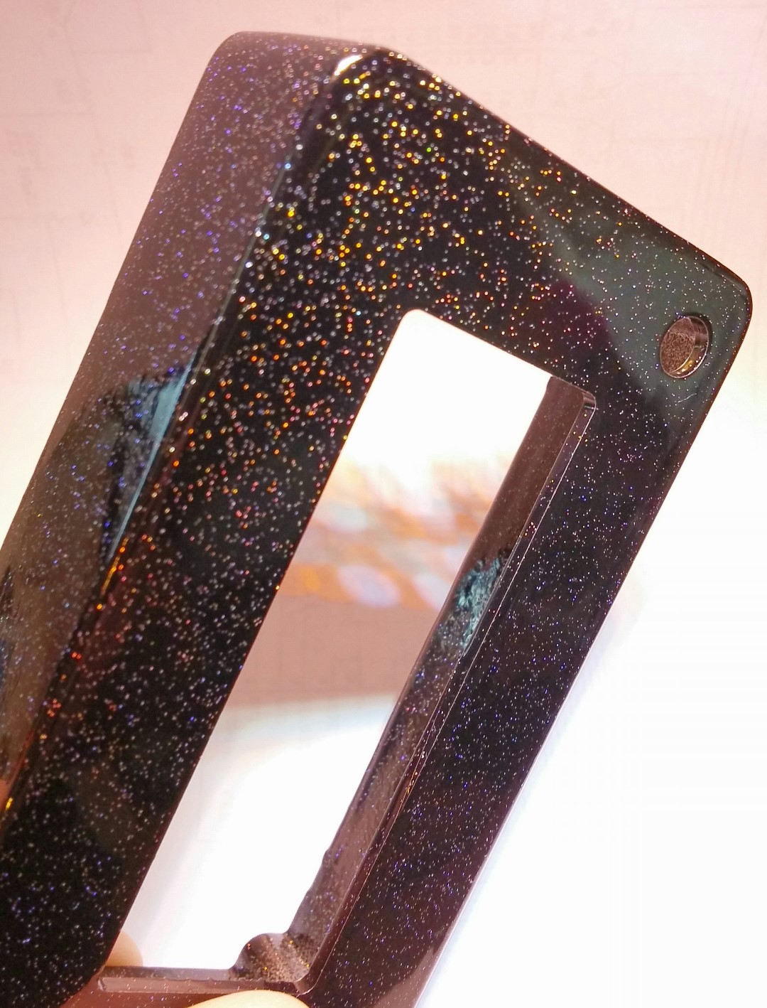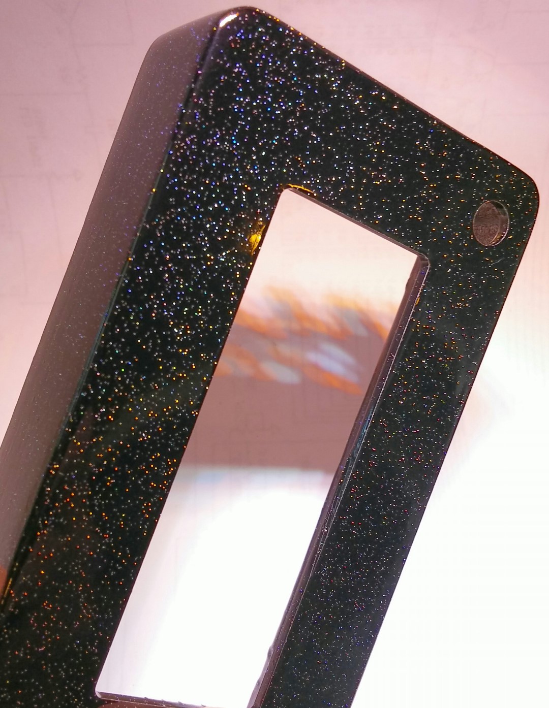 So for the backs of these, we were going to just screen print the metal backs that the boxes come with but we were just gonna put the same info that was already right there on the pcb.. so we figured that was a perfect opportunity to use a clear back! And then you can just read all the info off the pcb! Plus the backs can be used as an indicator that the box has power, they light up all around the edges if you stick an LED into it, looks pretty neat: