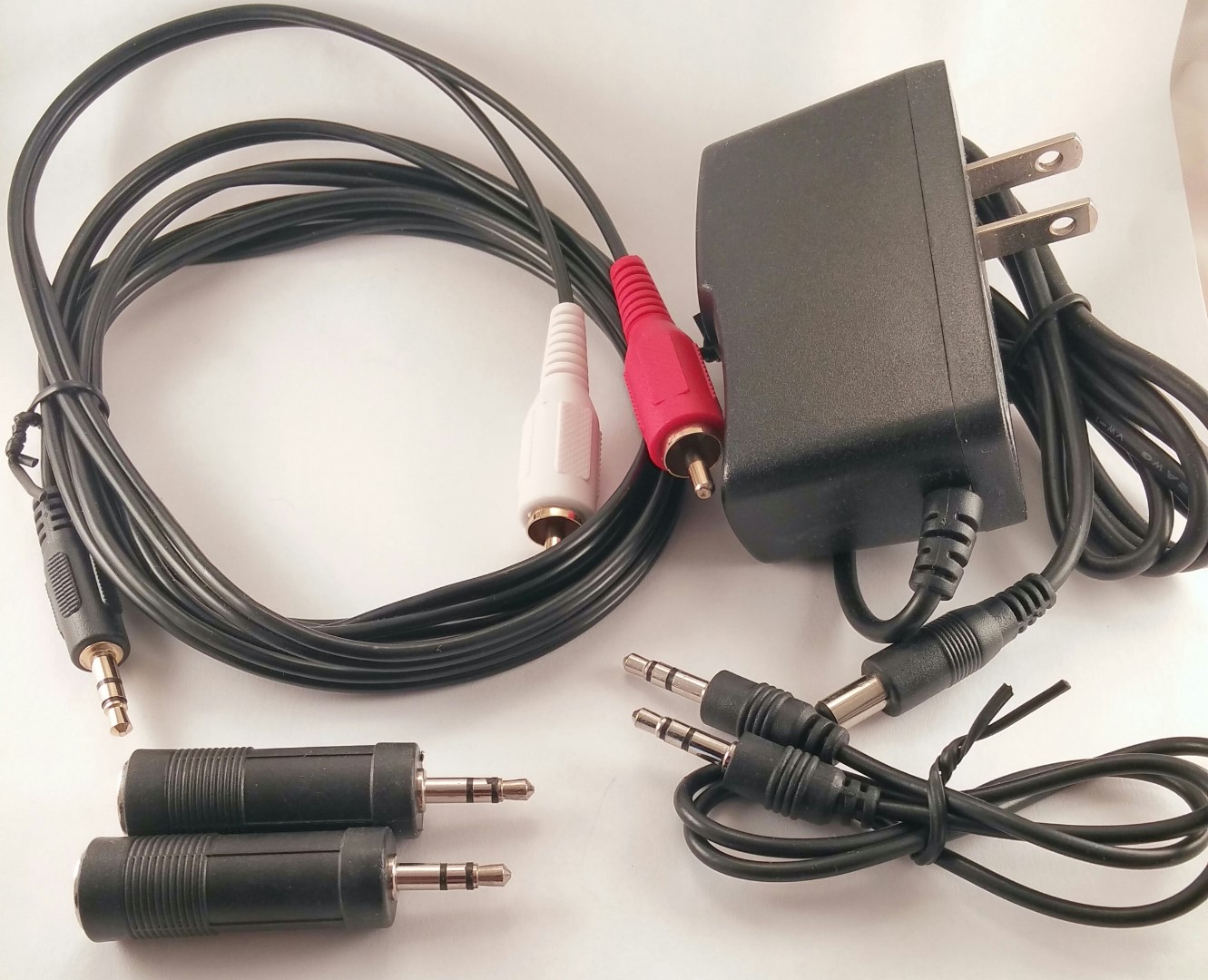 Here's what you get in the box, a couple of 1/4" to 1/8" adapters for your guitar/instrument cables, a 1/8" to RCA cable for your stereo stuffs, and a 1/8" to 1/8" cable for phones, tablets, computers.