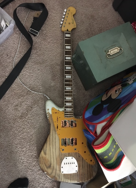 Was going to put this on the backburner, but I was able to snag a Baritone Jazzmaster neck for cheap over the weekend, and I'm reusing the gold pickguard that was originally on the body. So now I just need bridge and pickups, it seems. Trying to keep an eye out for some stacked jazzmaster pickups. We will see. If worse comes to worse I'll just get a Warmoth double humbucker pickguard made up
