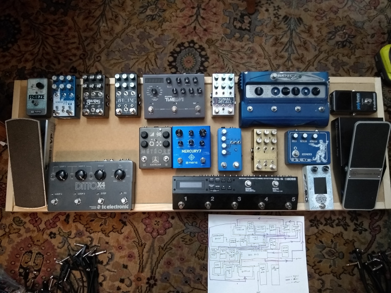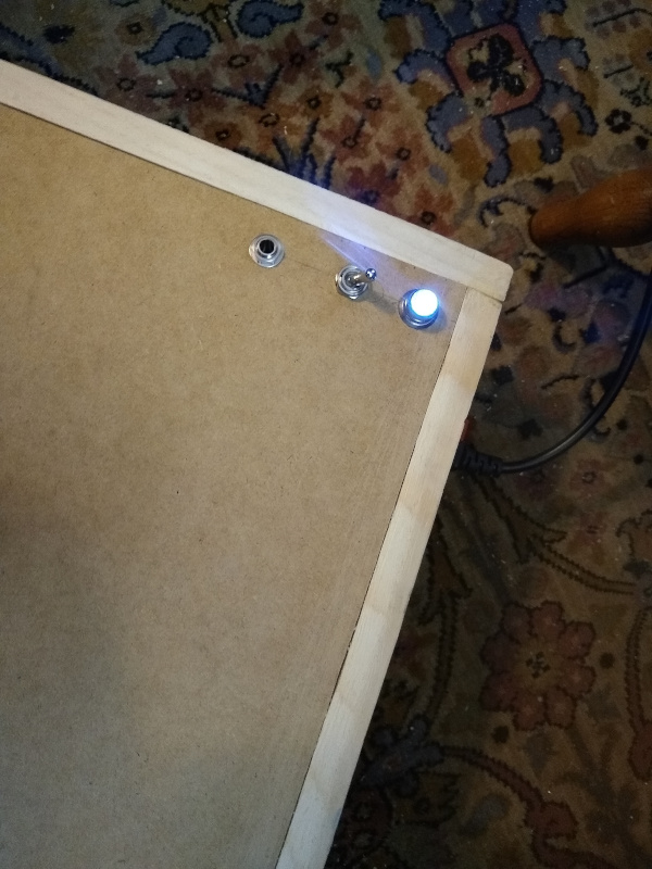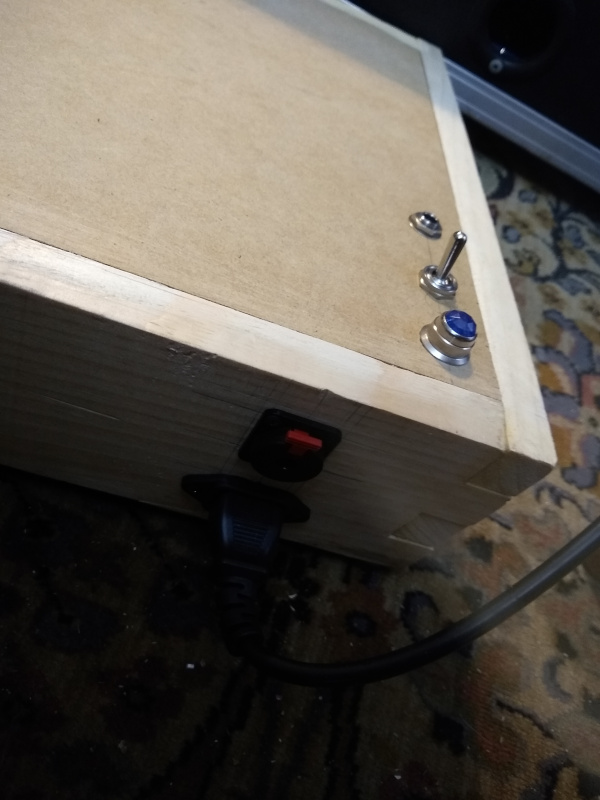 Not everything fit on the first try, but we got there, and everything fit well enough. The power outlet, LED, and on/off switch were a pre-wired harness I bought from West Coast Pedalboard. I built this board to save money and pick up skills, and this decision fought both of those goals, but I was already doing first-time wood-cutting, tolexing, audio wiring, etc., so I figured I'd get a little help with this one aspect the first time around. Next time (for my bass or baritone board), I'll probably try to wire something like this up myself.
