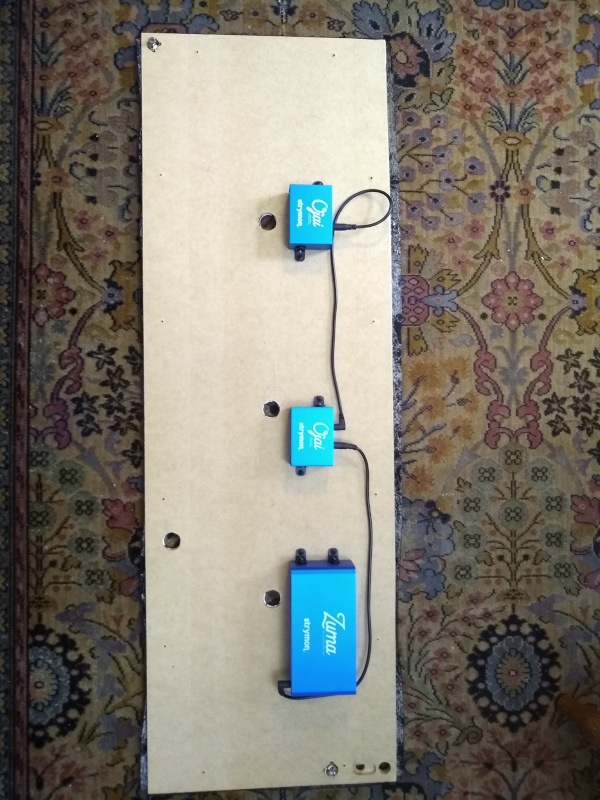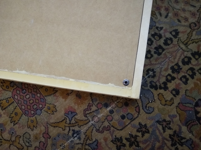 While the bottom of the frame was adhering to the tolex, I glued the carpet to the top of the board, placed gromets in the additional holes (that I apparently never documented drilling) that allow power cables and MIDI cables to travel between the top of the board and the area underneath, and affixed the power supplies to the underside (which I would later temporarily remove to spray paint this part of the board).