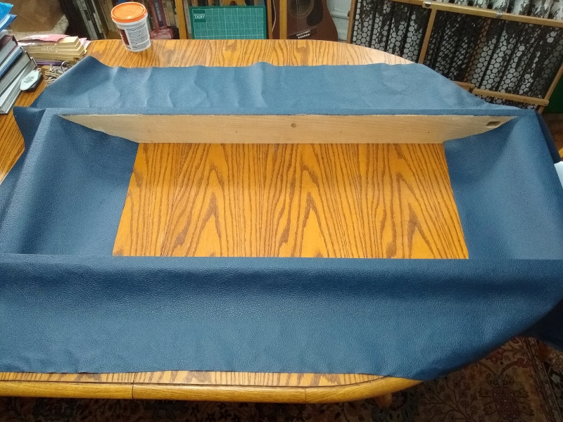 I didn't take any pictures of actually gluing the at-this-point cut tolex to the rest of the frame, because I needed to glue it all down pretty quickly after spraying, but I think these pictures give a pretty good idea of how I cut everything to make it fit. What I ended up with was a fully covered frame with seams at the corners on the sides and top, as well as along the inside bottom edge. Some of it turned out a little sloppy. Most of it is fine. Where the wood peeks through a bit, I just painted it to the approximate colour of the tolex, and you can't really tell without very close inspection. I assume this will need to be redone properly at some point, but it should look fine for a good long while.