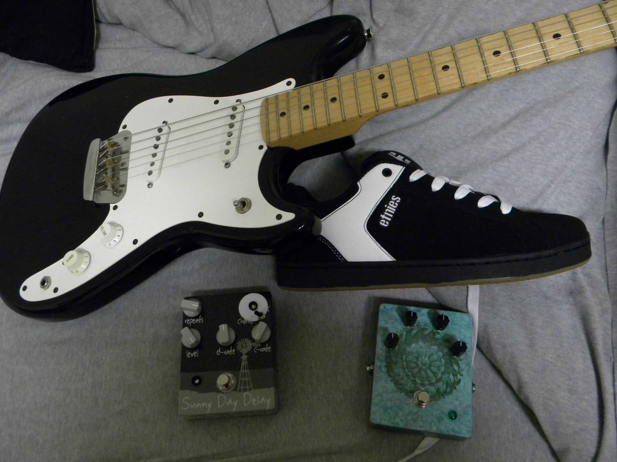 93' Fender duo sonic, Sunny Day Delay, Algal Bloom, and Etnies shoes to step on em with! :thumb: