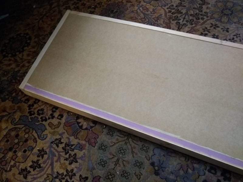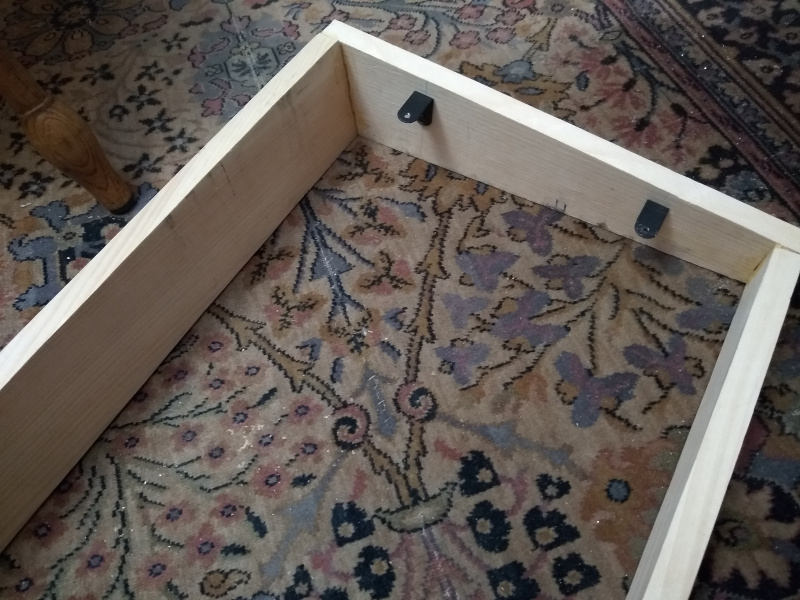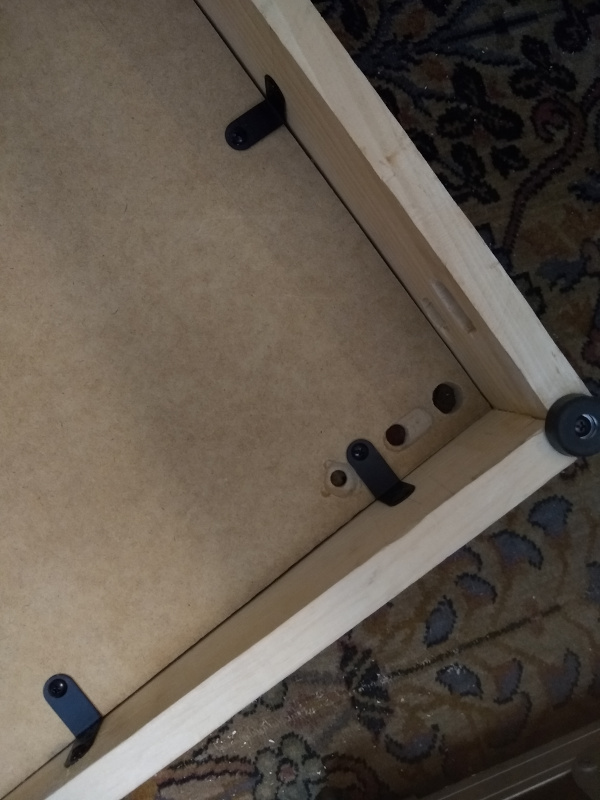 It's hard to tell from these pictures, but I painstakingly hand-shaved one edge of the top so that when it rested on the brackets it would rest flush with the back of the frame, despite being at an angle. I would later go on to shave down the top edge of the back of the frame to match this angle.
