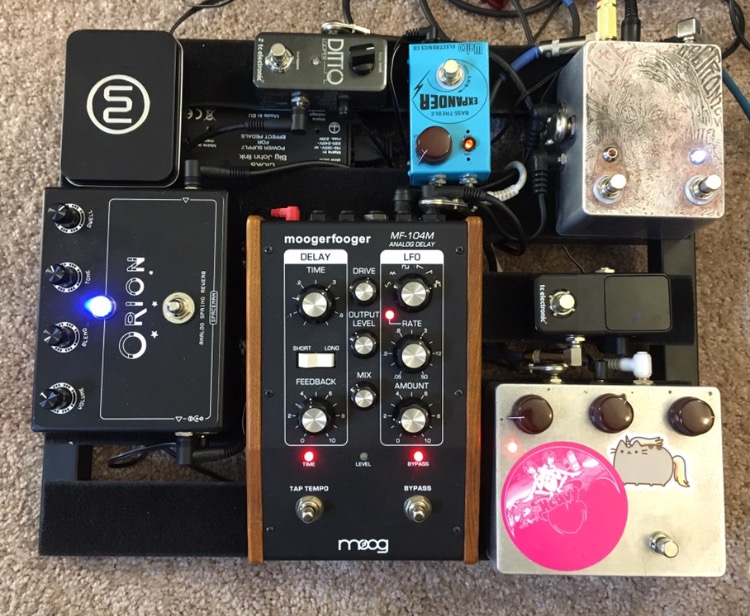 I used to joke that the MF-104M and some good dirt (and tuner, I guess) could be a whole board. That thing is so so so so great. I miss it. You can do delay-line looping, faux reverb, sample and hold 'sequenced' delays...has a great drive circuit, too. One thing that blew me away was syncing delay to MIDI clock, then using the time knob as a clock divider. When oscillating, the delays would play musical intervals--like, three contiguous knob positions would play a root, third, and fifth, so you could cycle back and forth between them and play a major chord with your oscillating delay. Which, of course, you could do with your foot via expression pedal. That's just one of many insane possibilities.