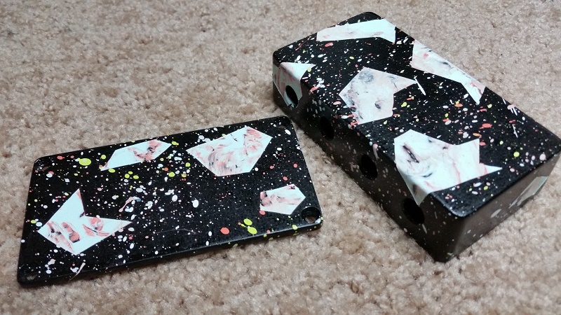 First one had multiple layers painted and removed with newspaper underneath then had cut pieces of painter's tape placed over it then black with flecks of paint. Sadly, I forgot to sand the enclosure and the paint ripped off when I taped it to drill.