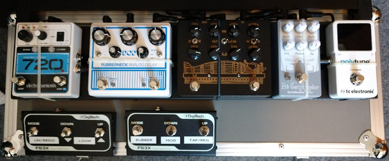 Small board (Pedaltrain Metro 24), used mainly for playing with just a drummer, is currently: Polytune > Bit Commander > Sarcophagus > Rubberneck > 720. Two FS3X make better use of some of the functionality of the Rubberneck and 720. Powered by 1 Spot.