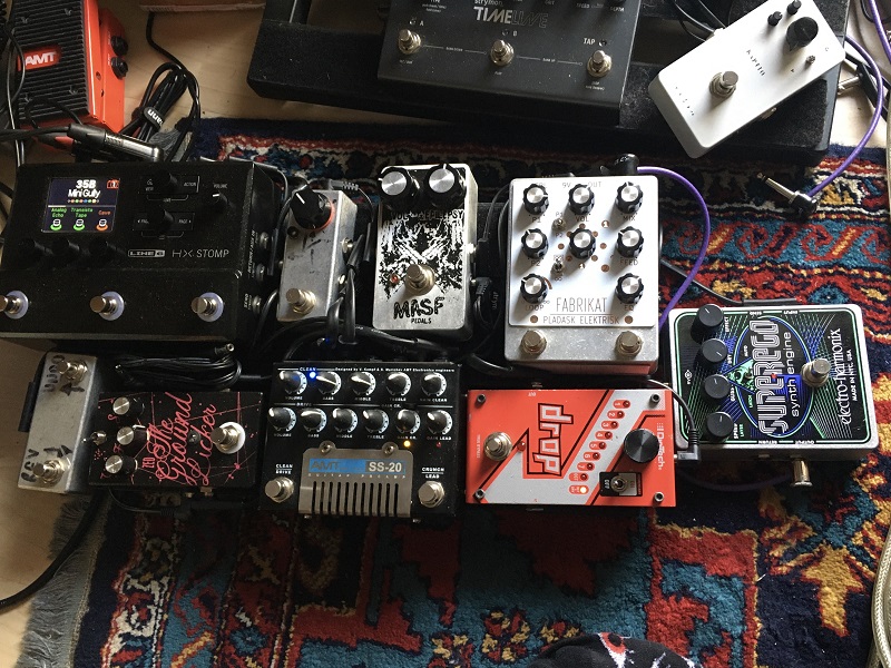 Bright Onion utility box (A/B inputs, buffer, loop etc) -> Kowloon Walled Bunny clone/Treble Boost in one box -> Harmonic Percolator -> Micro Amp clone -> TC Flashback 2 X4 -> Alexander SpaceXpander -> Radial ABY