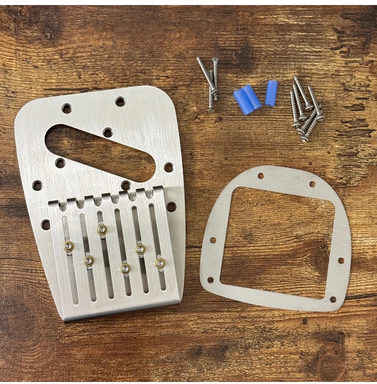 The more steeply cantered Tele bridge pickup is kind of an odd choice given that the canter on the Tele only happened to reuse an existing lap steel pickup design without having to redesign it for a narrower string spacing. I’m assuming we’re narrowing again at this tailpiece so that a more conventional pole-spaced pickup might work straight or cantered.