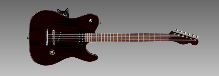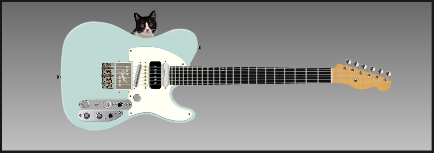 this one is my J.J Cale-style Frankentele. the toggles on the upper bout switch the 2 and 4 PUs (the lipstick and the P90) on/off, so in conjunction with the 5-way pickup switch all combinations of two PUs and most if not all 3 PU combinations are available. the knob and mini-toggle control the bridge Wide-Range humbucker; the toggle switches single-coil/parallel/series. the pot with the Fender amp knob controls the volume of the neck PU; the regular Tele tone knob controls the volume of pickups 2 and 3. the regular Tele volume knob gets a stacked pot and acts as a master volume/tone control. the cat keeps me company.