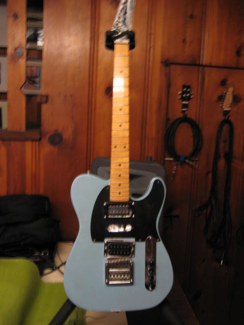 An old Tele pickguard with holes for a neck humbucker and middle Strat pickup