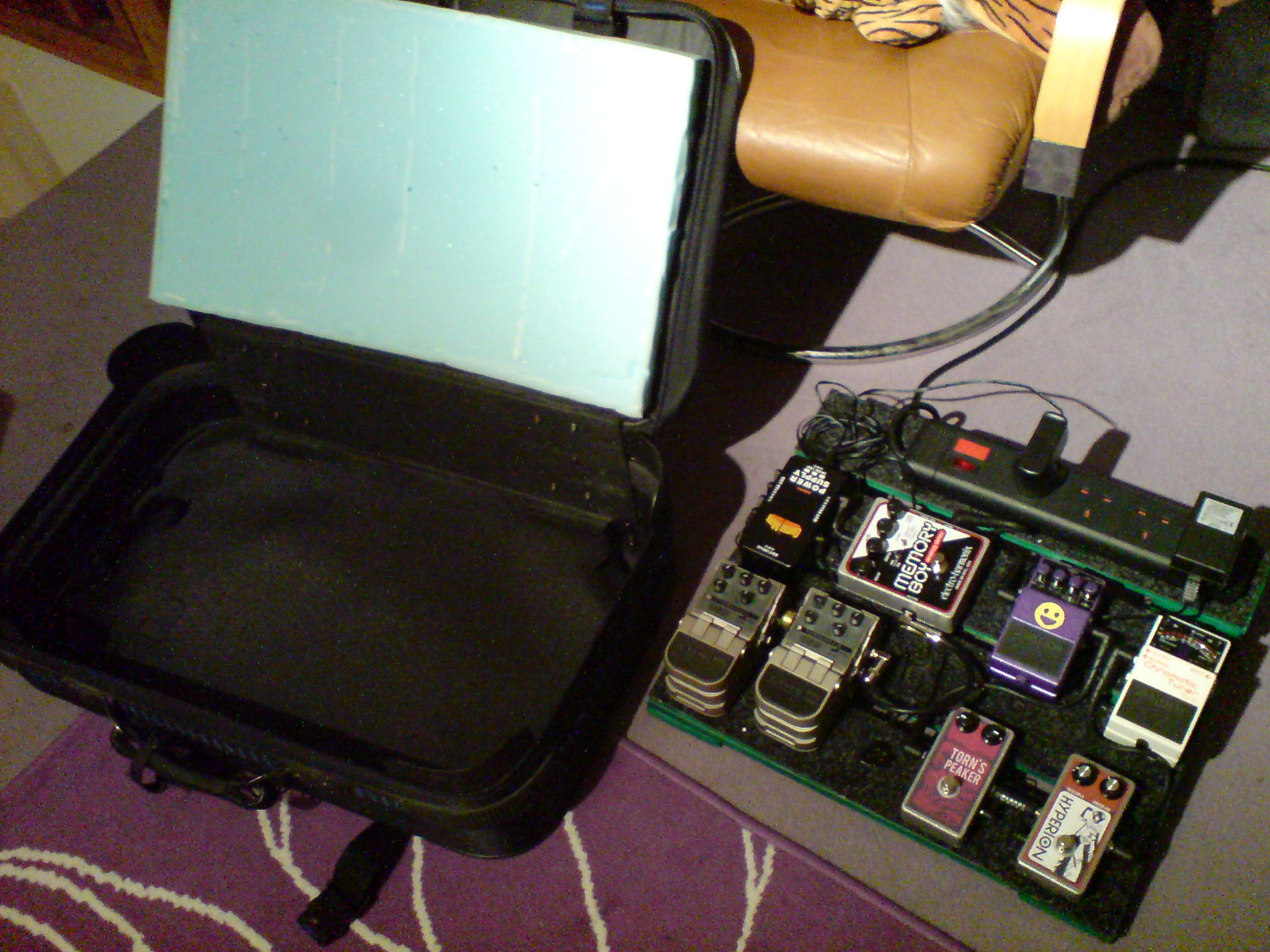 Hi. This is my diy pedal board. This is version 3 I think. Made it out of the remains of my old backdoor and is based roughly on a pedaltrain. Had to make amendments to the legs so that the board could fit in the suitcase - the legs are now underneath the board rather than on the end. Much lighter than my previous two!!