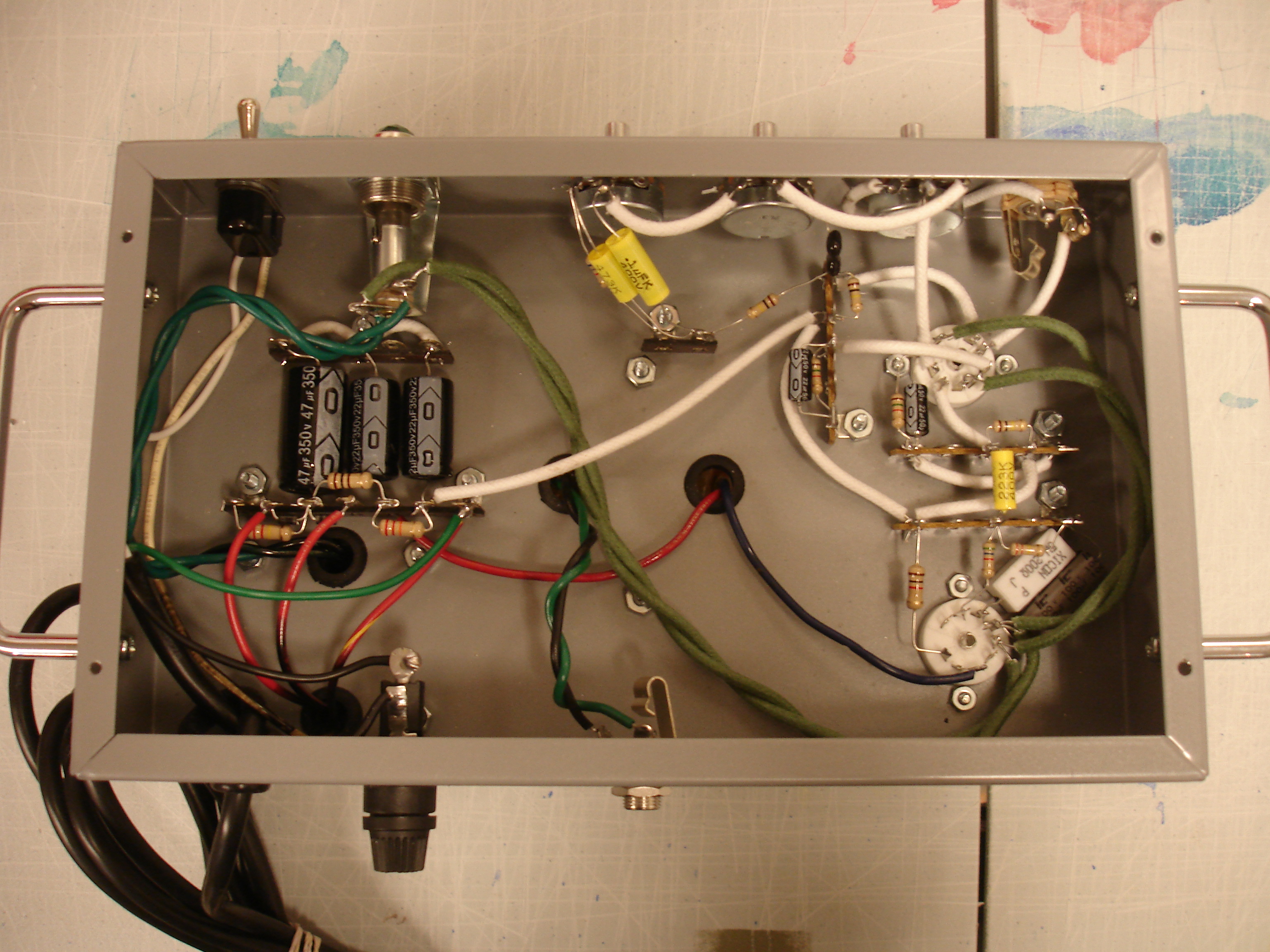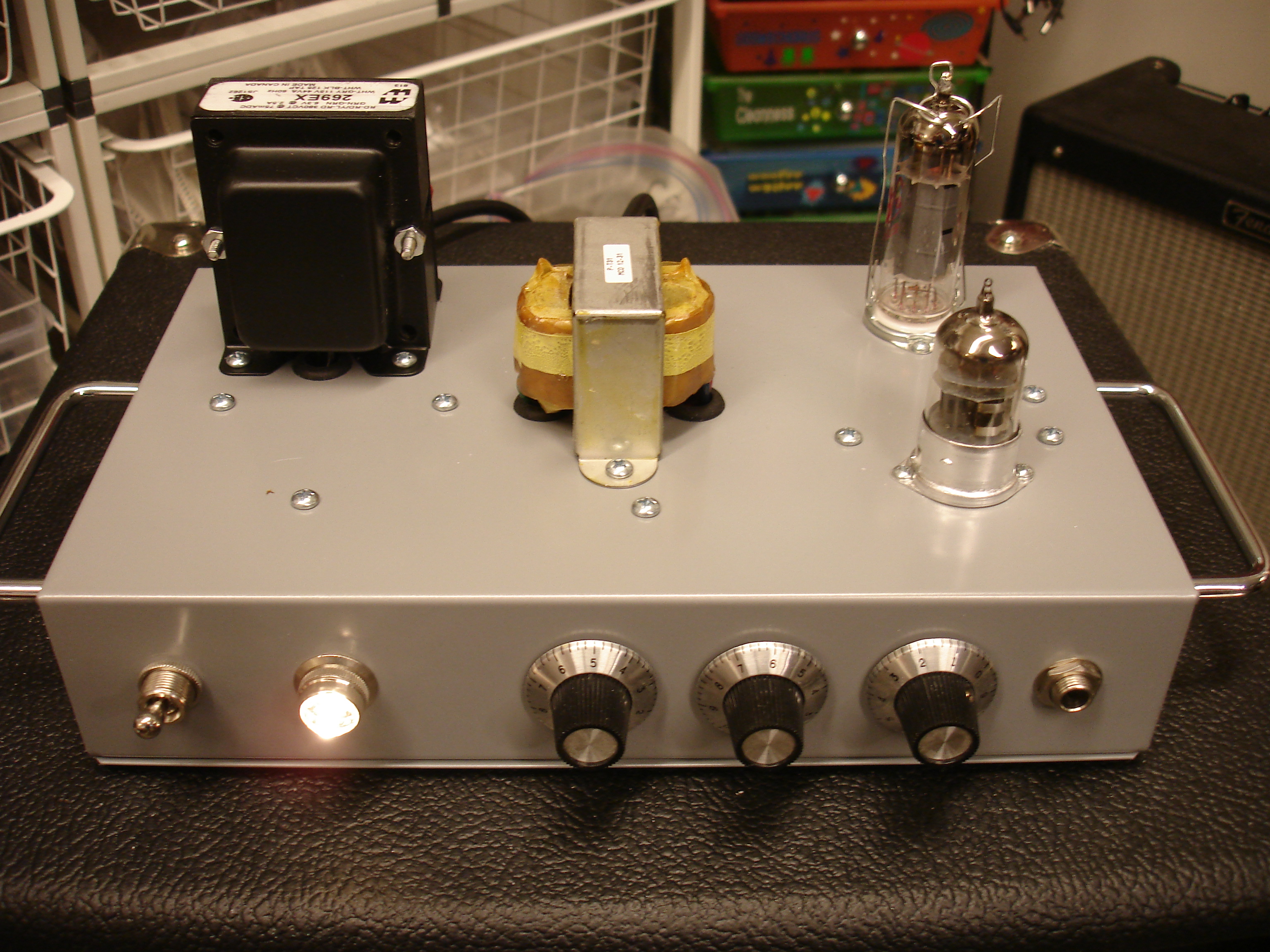 Here's what it looks like inside, only has maybe a dozen resistors and caps to the whole circuit: Here's the finished amp: And here's it sitting on a 2x12 cabinet: It's a great sounding little amp! It stays nice and clean to a modest volume, loud enough to bother people for sure, and then beyond maybe 4 on the volume knob it goes into a really great overdrive and then into a pretty mean distortion. I'd highly recommend the project and I think you'll dig the result bigtime.