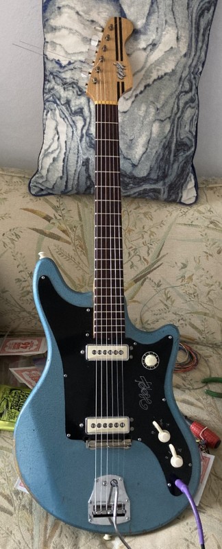i just finished putting this together...it's a West German guitar from the 60s called the Hopf Twisty. i bought the body with electronics way back in 2012 or 13 off eBay. i put a Höfner Galaxie neck on it but it didn't work well because the Höfner neck is 22 frets and the Hopf neck is only 20. i found the correct neck on an obscure German parts seller's site (my Google Fu is strong) as well as the loaded pickguard from a later Hopf, the Jupiter 62. they're the same as the ones in the extremely groovy and rare Saturn 62, which you might remember Boz Boorer playing with Morrisey early in his solo career. they're quite snappy, way more aggressive than the primitive and rather delicate sound of the original pickups (for a look inside the old ones see the early pages of my Project Guitars thread). the bridge is model correct and came from eBay. i haven't really gotten into it yet because i'm still setting it up, but i'm really happy with it. and it's another cool blue guitar, which would only be better if it was green. the world needs more green guitars.