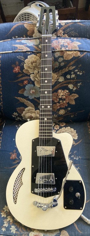 it really doesn't sound like anything else i've played or heard. the different vibes of the 2 pickups make for one of the more dramatic center-switch-position sounds i've heard, definitely not hiding in the background at all. the neck PU is softer, more distant-sounding, and vaguely reminiscent of a good gold-foil; the bridge pickup is snappy, in your face, and trebly enough to hunt Telecasters. i've always been a bit dubious about the the Les Trem tremolo, but it works quite well. more of a Teisco/Kay feel than a Bigsby. the guitar came with a roller bridge (also a Goldo part) which is the only example of that category i''ve ever seen that doesn't rattle AT ALL. the tuners are closed-back 3-on-a-strip, and astoundingly steady. you have to work a bit to turn them. not a millimeter of play i can find. strangely for this sort of design, the tuner shafts don't run all the way across their place but rather are styled like a regular Kluson-oid tuner whose post stops short of the other side of the aperture. this actually is a good thing, though, because you have more options when winding strings.