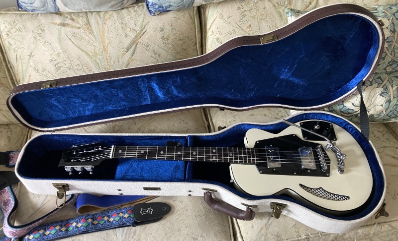 i’m pleased to note that despite its apparent oddness, the Wandré fits snugly in a generic Les Paul case. i was a bit worried that it would need something like a Gretsch Jet or Epiphone Kat case which is more expensive since they're less common. now i need to figure out the case fit for the Hopf, which won’t fit a Duo Sonic-sized case because of that honkin’ huge upper horn…it's 20.5-21" while the body compartment in a Strat case is usually only about 19" so i’d have to chop a section out of the divider/storage pocket and that’s kind of silly. i’m sure it’ll fit in a Strat case but will check dimensions on the Jazzmaster-sized cases.