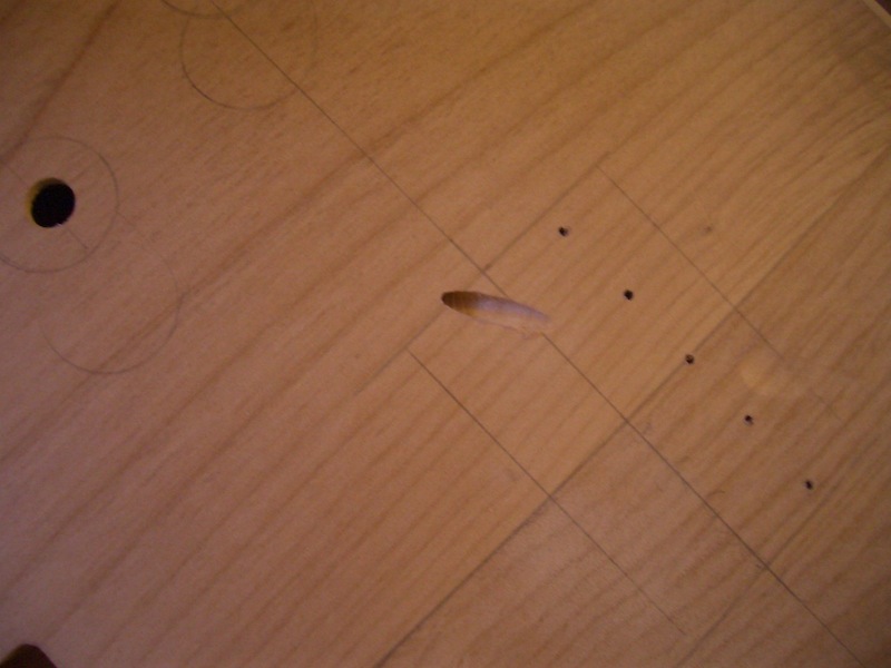 First attempt: the hole on the right. Due to the space the power drill needed, the angle was very steep and if I had continued the drill would probably have exited the back of the body before hitting the control cavity.