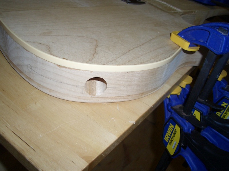 Second attempt: drill from the control cavity in the direction of the pickup (hole on the top left of the control cavity), which came out just where it should (hole on the left, pic above)