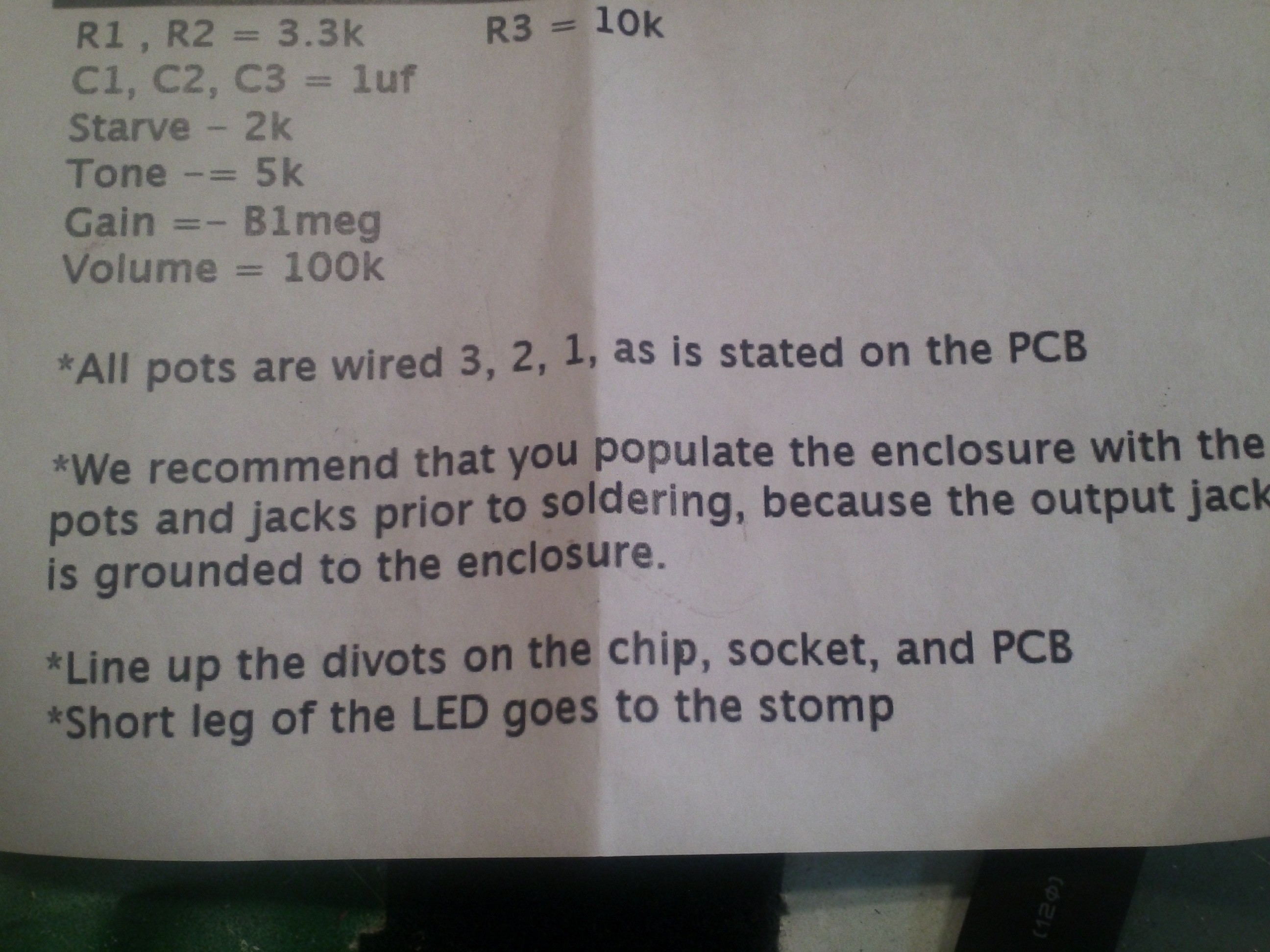 stripes wrote:hey, i just got myself this build but left the instructions sheet at my apartment, which i won't be at for a few days.. days in which i plan on building this pedal. could someone take a picture of that instruction sheet for me? :D