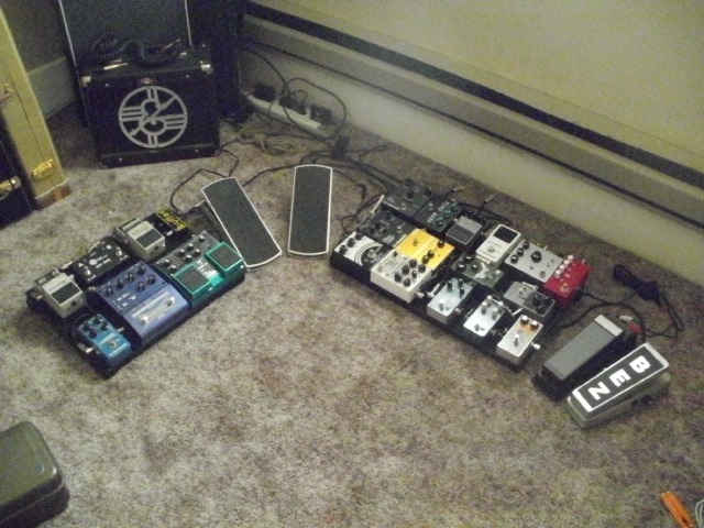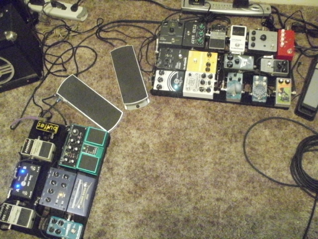 main board: BEZfx Street Sweeper->Mellowtone Hi Five->Algal Bloom->3-knob Great Wall (with the pyramid)->Tall Font Russian->Sound Shank->Goodbye 24 (with Schaller F 121 volume pedal as expression pedal on R, next to the Street Sweeper)->Randy's Revenge (v.1)->PolyTune->barrel adapter in/out to Ernie Ball volume pedal on left->RV-3->Copilot FX Gyroscope->EMMA DiscumBOBulator->Seppuku Mind Warp->TC XII phaser->TC SCF chorus/flanger->Ghost Echo