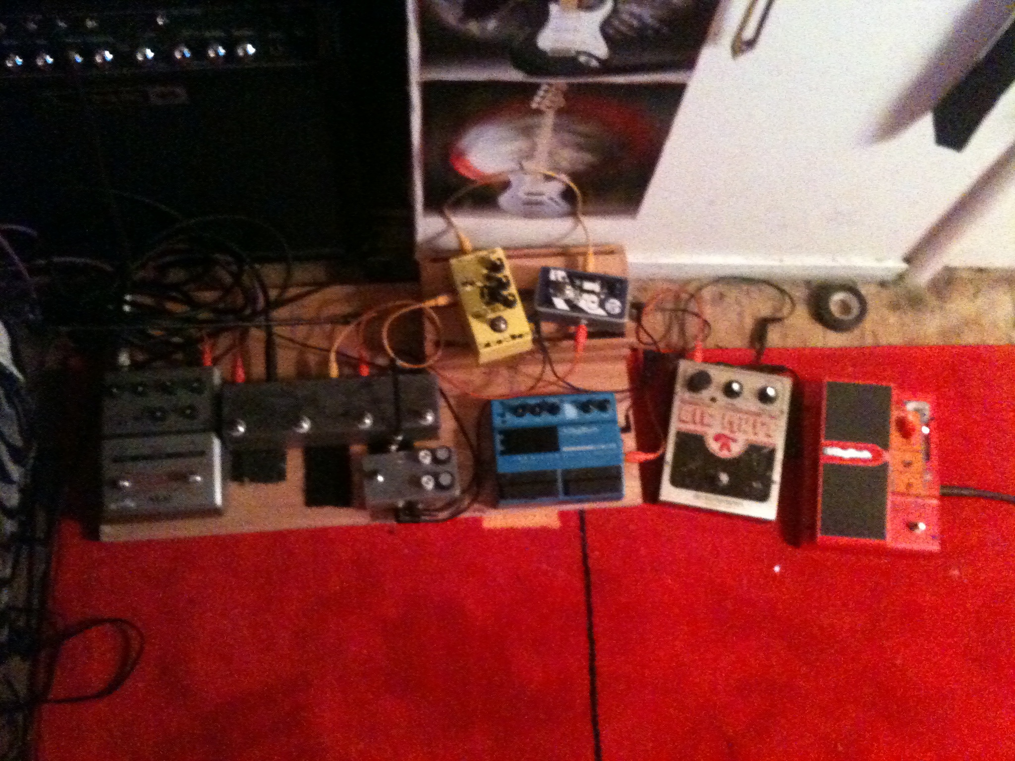 Current itteration of my board. All of the new shit borrowed from Behndy. Chain is Digitech whammy > big muff pi > Digitech two second delay > Mini-fuck overdrive > custom hello kitty robot looper: L1: Torns Peaker > Idiotbox death ray, L2: Sleepdrone 5 in, > Akai ED-1 Headrush.