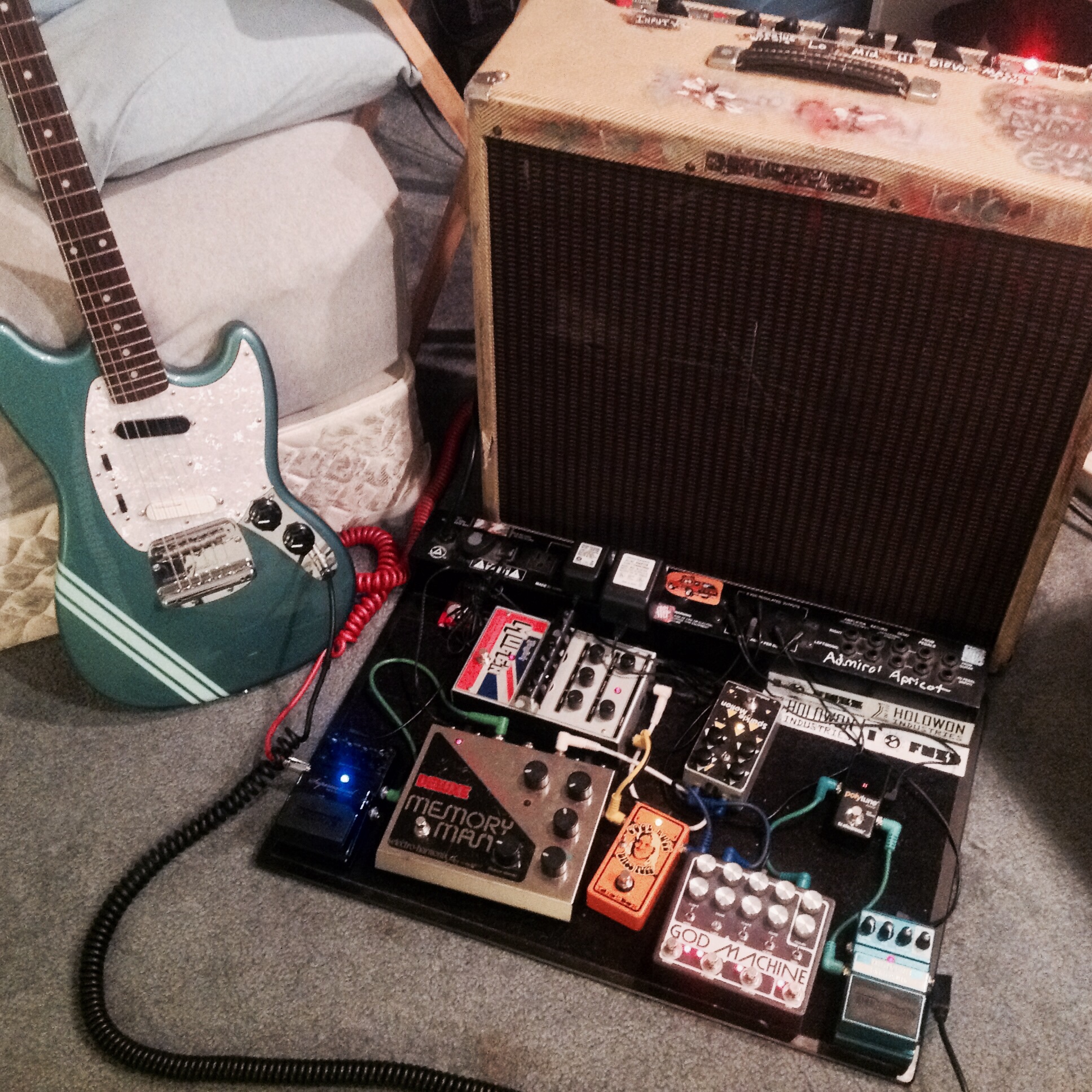 Thanks! They get along wonderfully but I like to run them through separate amps. I'm planning on building a fuzz and distortion to run after it but I have just been experimenting with a Russian Big Muff. Trying to master a 3 amp setup.