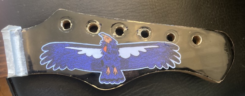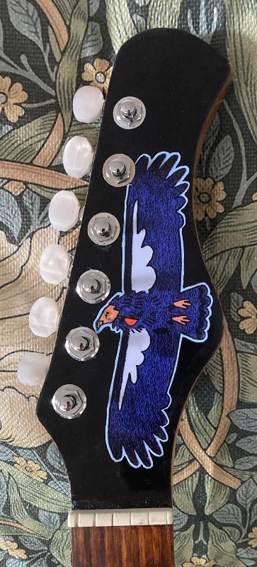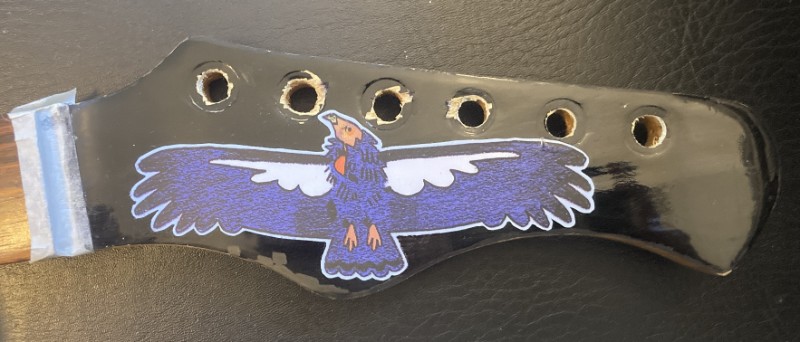 the Hopf still needs a bit of tinkering but i really don’t feel like going back in there today so i got out the Kondor. i pulled the pickguard to see why it wouldn’t lay flat and concluded that it’s because the guard has been bent enough in the last 60 years that it has a generally wavy profile and isn’t flush in other spots. so i screwed it back together and stopped for a rest. next thing is clearcoating the headstock to secure the condor sticker i found on Etsy. i plan a practice session where i experiment with different applicators—i have regular brushes, foam brushes, and maybe others. i’ll see what gives the nicest flat surface result. i figure that to keep dust off while it dries i’ll lay it flat with a shoebox or other cardboard container over it so dust can’t settle. remains to be seen when the headstock will be done. tomorrow is possible, but i was sick all week and am not at 100% at all. last will be sanding the damaged body edges and using the StewMac black lacquer marker.