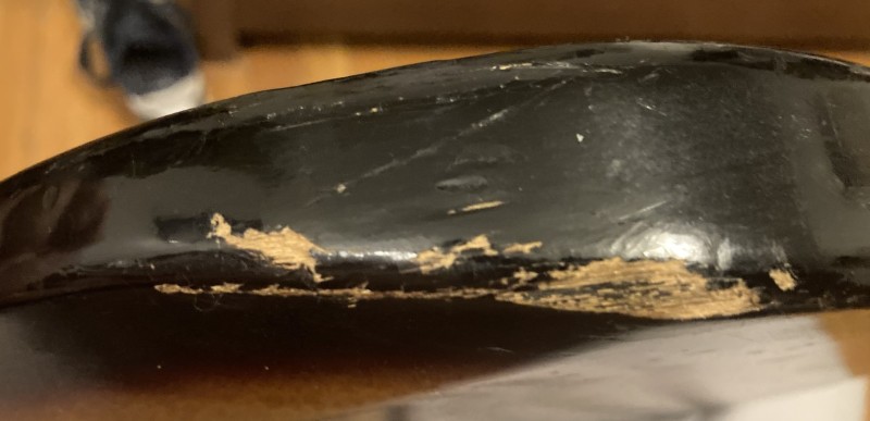 the Kondor is coming along. the areas i'm working on were crunched/splintered, assumedly from being dropped onto a concrete floor from standing height. the first shot shows damage that's untouched; the second shows the side that i tried to treat with the lacquer marker alone. you can see that the surface remained pitted, and the area that had been crushed showed obvious rough grain.