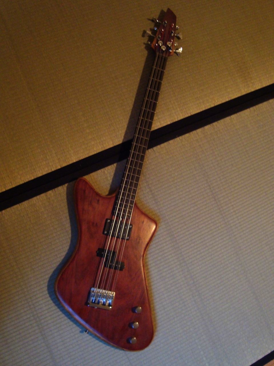 Myrtle body, padauk top and neck, ebony fretboard, Dimarzio model one neck and ibanez P pickup, tuned BEAD and the bass strings are flats and the octaves are rounds.