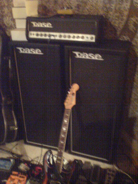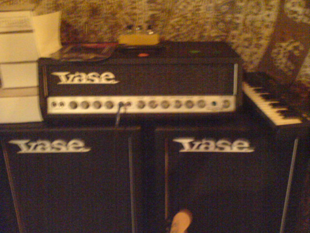 Once again, sorry for the shitty photos...this is a Vase Trendsetter 120, with 2 2x12 stacks (and room for a 3rd in each). This is the loudest amp I have ever played - volume and master at 5 just makes me want to shit! but the tone is everything Ive ever wanted - I have 3 Vase amps, and this is the only one with a master volume, so its not only perfect for deafening people at a gig, it records beautifully too. Ive had AC30's (newer and vintage), a marshall, Fenders etc, but this is the one for me. Vase amps were made in Brisbane between 65-73ish, and used to be plentiful and cheap around here, but recently people realise how good they sound, so the prices are going silly. The Trendsetter 40 I have made my old vintage Top Boost AC30 sound like a toy, seriously (and I love those jangly tones from the AC30). This big boy has Vase branded speakers, Alnico, probably rebadged Rola's or Plessey's (old Aussie speakers). Ive always loved vintage gear, but this was like the holy grail for me - it even came with the original vinyl amp and stack covers - in near mint condish. Vase amps have recently re-opened, making hand wired amps again, but I havent heard how they sound - if they are anything like the originals they will be fantastic...but $4000au for a 60w amp is a little much, when I got this for $900! Alot of people are wising up to how good the 60's Aussie amps sound - Goldentones, vadis, Wasp etc, so now its not only the collectors who want them.