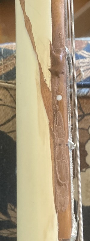 i decided the best thing to do first was to fill the divot left after i dug the white paint and filler out of damage to the fretboard on the bass side at the 2d fret, assumedly the main point of force in the break. that seems to be going swimmingly for the moment...the filler looks much more in tune with the paler-rosewood board than it did with the mahogany on the Kondor body though of course it isn't dry yet. i also spread a little filler over adjoining areas of the board edge which had white paint impregnated into glued cracks that i couldn't get out without doing violence to the edge. it's deliberately thicker than it strictly needed to be so i have a bit more wiggle room when reducing it. once that's dried and been sanded i'll clearcoat the divot and the exposed edge of the board in the adjoining areas, which is about 2 inches. there's another spot where the finish on the edge of the board is funky down by the neck join, but i haven't decided whether to redo that as well. when the clearcoat had dried and been sanded down i'll tape it off and start with the CA. i still plan to try the CA out on the body ding first where a lousy result would be less consequential. perhaps later, after more coffee.