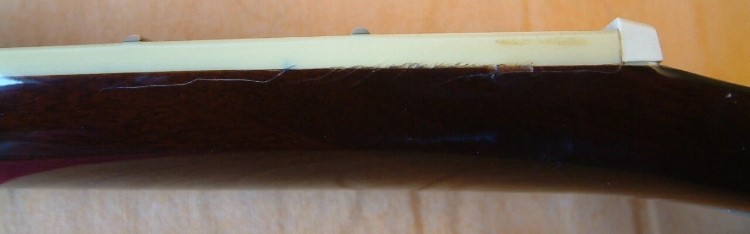 you can see that something messed with the stability of the connection of the neck and fretboard. on examination, though, it doesn't look like anything's been knocked significantly out of place, though i wonder about the white area beneath the end of the nut in the last photo. it shouldn't take too much to sort it out. if it works as-is i'll just fix the finish and move on. i asked my friend Charlie, who's been at this even longer than me, what he thought and he said "i've had guitars that looked like that for years and nothing happened. i also had a guitar like that that did need to be fixed and after glue and a clamp it was fine."