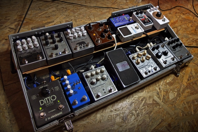 Basically it goes : EQ/booster - > pitchfork -> tuner -> dodfx17 with custom circuit -> giant hogweed fuzz -> stammen -> molecular disruptor 1 -> clusterfuzz -> bipolar bear overdrive -> twin peaks trem -> double EQ -> ct5 -> disruptor 2 - > ditto