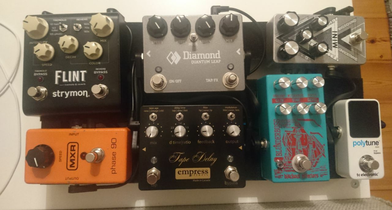 Polytune -> Mini -> Blunderbuss -> Quantum Leap -> Phase 90 -> Tape Delay -> Flint