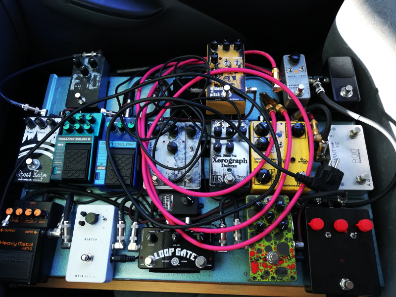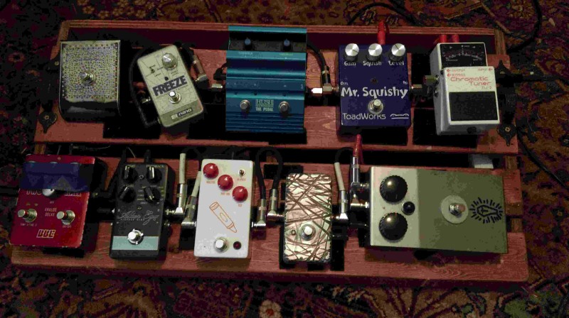 Boss TU-2, Toadworks Mr Squishy, modded EHX Freeze with external switch, Rocktron Hush, Dirge rangemaster, homemade Green Ringer clone, JHS Crayon, TC Electronic Alter Ego 2, BBE Two Timer