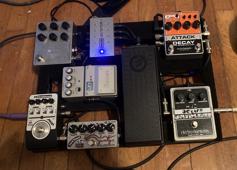 signal path: EHX Octave Multiplexer->EHX Attack Decay w/Moog expression pedal->FairField Circuitry Shallow Water->Ibanez LF7 Lo-FI->Zvex Instant Lo-Fi Junky->Muza FD900 reverb/delay.