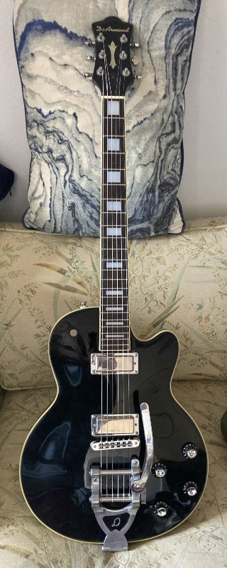 i have the M-77T out because replacing the pickups is near the top of the list, and when i looked at it sitting on the sofa i was suddenly struck by how much the black guitar with its Bigsby and the chromed Firebird rings looks like Old Black. which is funny because i've been a Neil Young guy since 1970 but never noticed it before...i was only seeing it as a Firebird pickup platform. after corresponding with Anthony at Pickguardian i decided to just order a stock M-77T pickguard and file/polish the cutouts as/if necessary; the footprint of the Firebird rings is maybe 1 millimeter wider/taller than the DeArmond pickups they replace so it shouldn't be too terrible. if i fuck it up at least then i'll know how the stock template needs to change. unfortunately he doesn't have an electronic file of the stock template. i'm waiting to order that until i get paid next week, but won't wait to do the pickups.