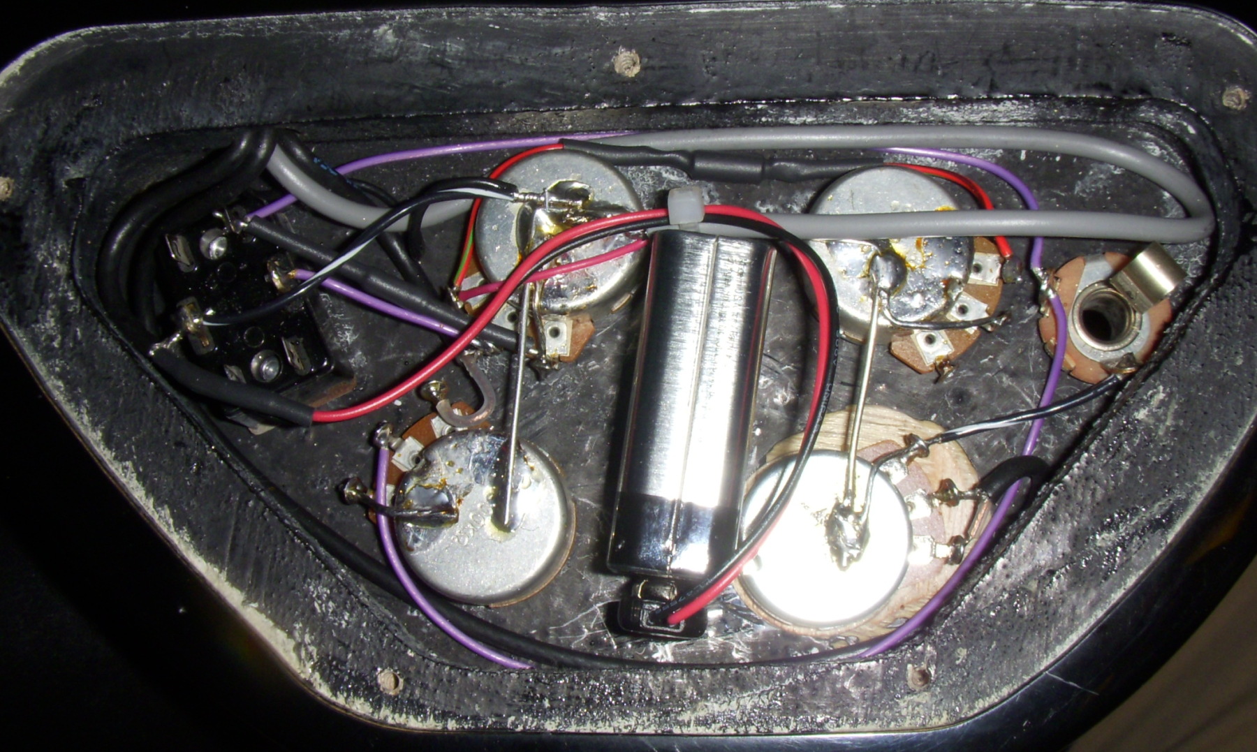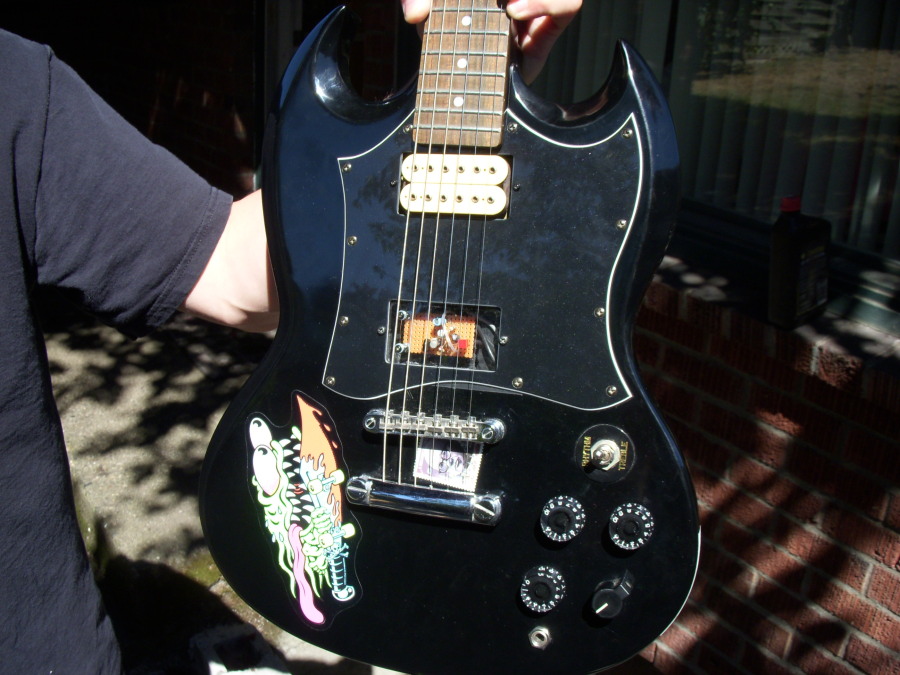 I just showed you my best guitars. Well now it's time for my worst. My brother gave me a beater Epiphone SG and that's what I started playing on. It didn't take long to figure out it was a toy for children so after I started getting better guitars around here I decided to hack on it. I only ever use the neck pickup on any guitar and it seemed natural for me to remove the bridge one and throw a silicon Fuzz Face in there. The top two knobs control the neck pickup like on any SG and the bottom two are Fuzz Face controls now. This is VERY early in my pedal building development so don't laugh too much at the wiring please